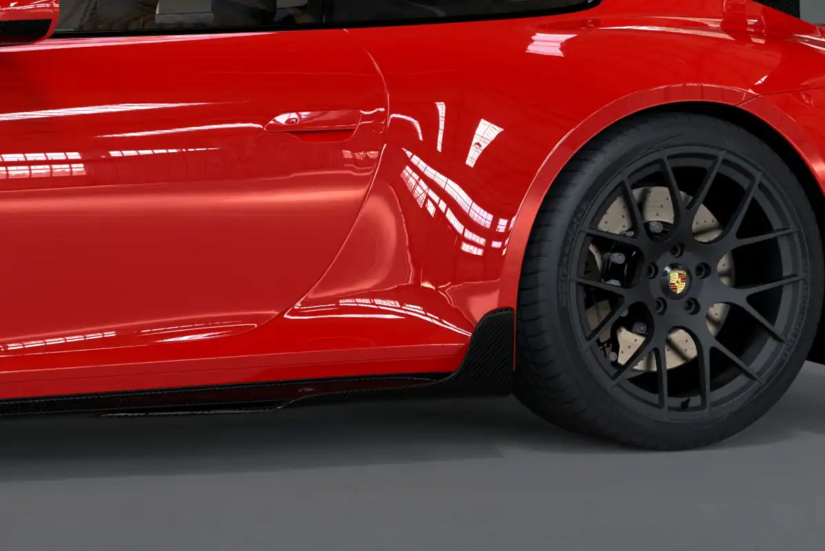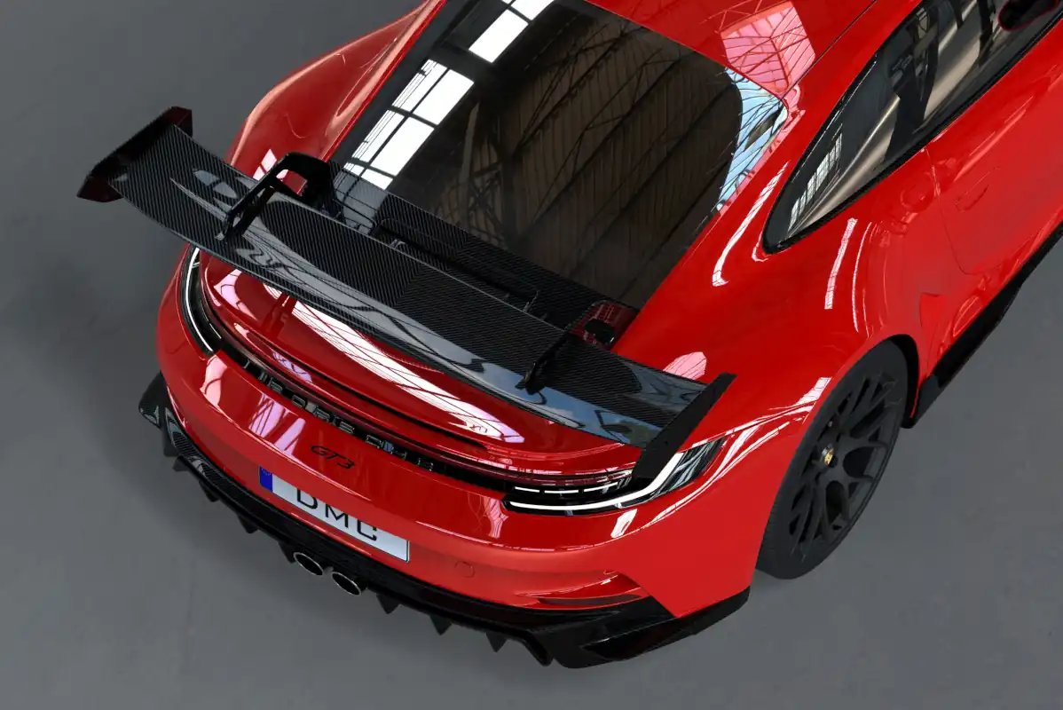 GT3-RS inspired lines of the DMC carbon parts determine the strong styling of the new aerodynamic package for the 992 GT3 models. This includes the carbon lightweight aero front fenders with wheel arch louvers, the particularly wide carbon side skirts. The front bumper’s inner grill, the rear diffuser and the front hood design have not been modified, but they are replaced with ultra light-weight carbon fiber parts – an option that is not even available from OEM Porsche yet.
