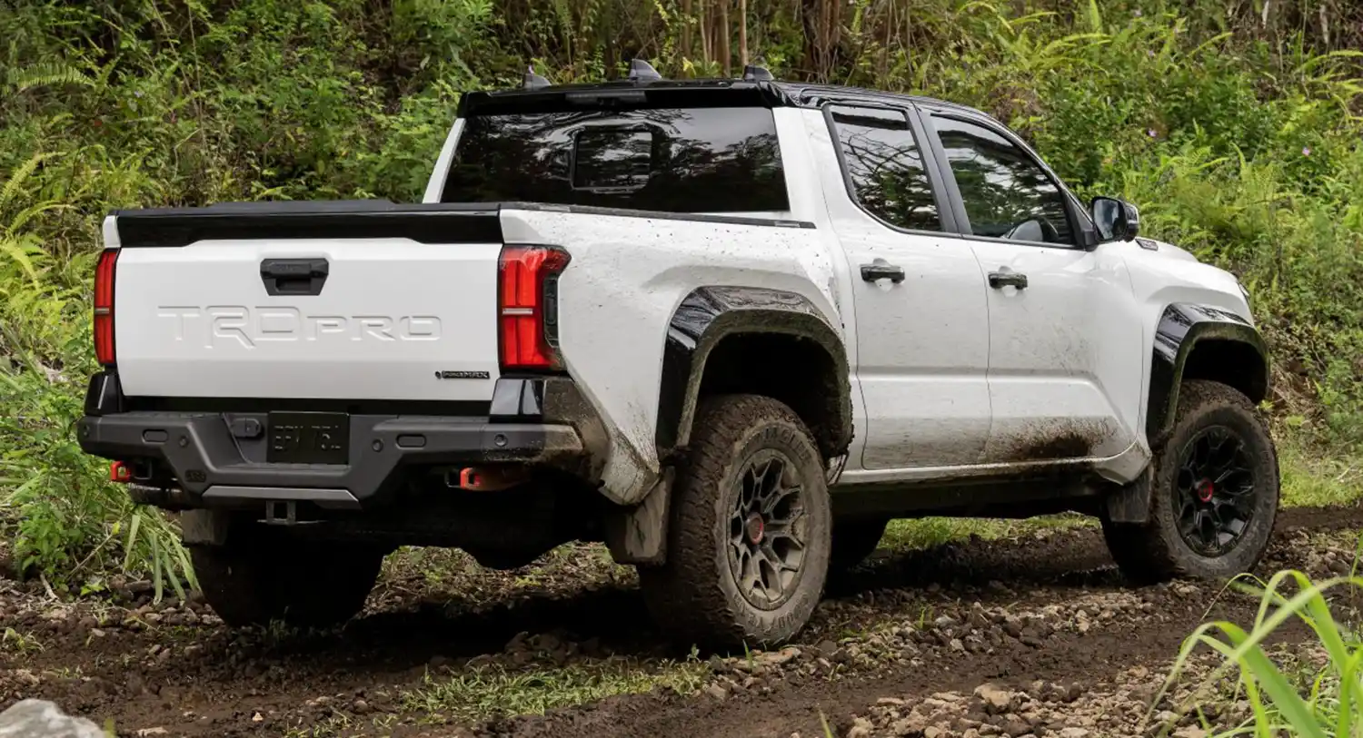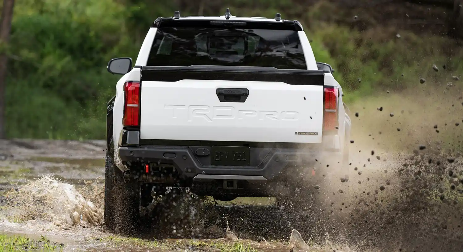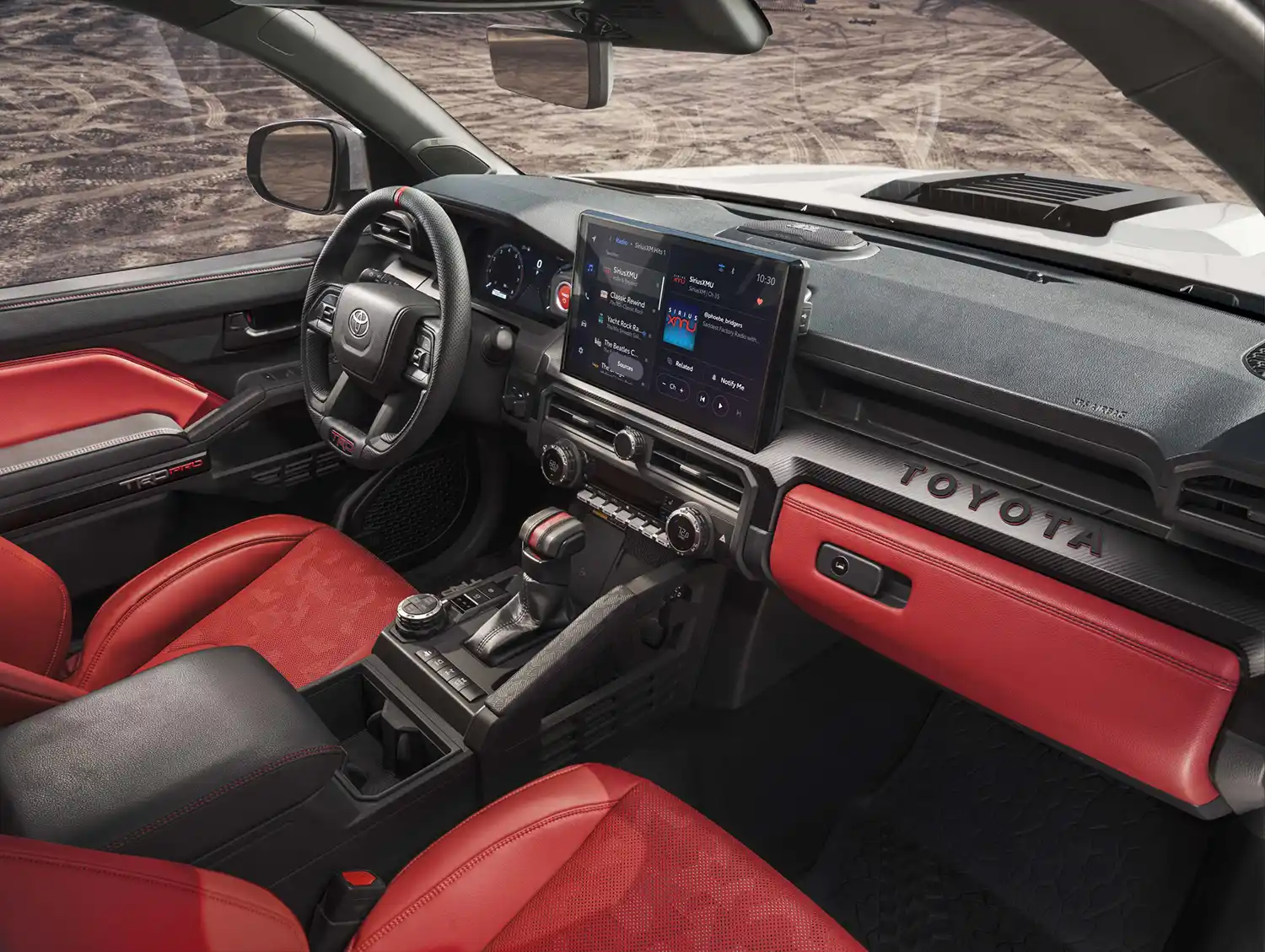 Tacoma has up to 33.8-degree approach, 23.5-degree breakover, and 25.7-degree departure angles on TRD Pro without the tow package. Running ground clearance maxes out at 11 inches on TRD Pro. And with tons of available cameras installed on the new Tacoma, TRD Off-Road, TRD Pro, and Trailhunter drivers can view potential obstacles that are looming on the trail via the Multi-Terrain Monitor that can display crisply on the available 14-inch touchscreen. For the sketchiest of situations, Tacoma offers standard front and optional rear recovery hooks and underbody protection.