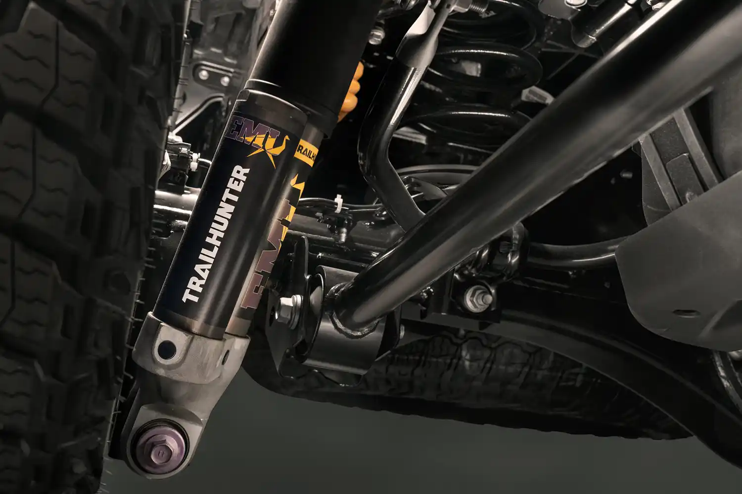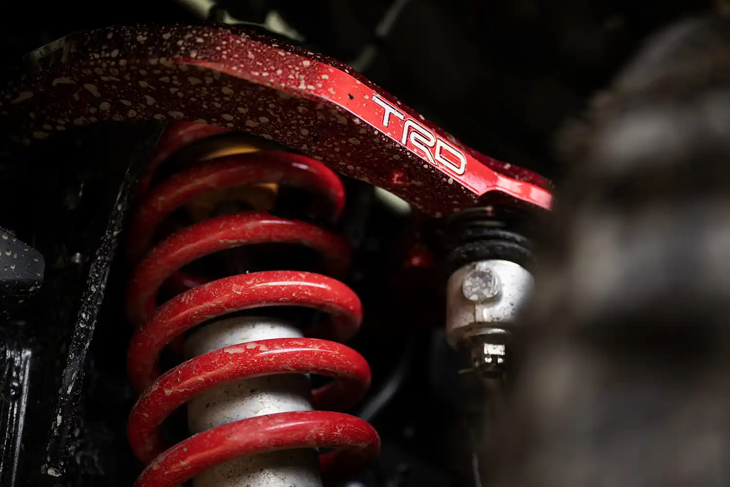 While Trailhunter is specifically developed for off-the-grid overlanding adventures, Tacoma TRD Pro elevates its proven go-fast, desert running attributes for its newest generation. Red aluminum front TRD upper control arms optimize front geometry and reduce unsprung weight, while Fox internal bypass 2.5-inch manual modal Quick Switch 3 (QS3) shocks can be adjusted to three different settings via dials on the shock bodies to tune compression damping. Built around the new multilink rear suspension, FOX Internal Floating Piston (IFP) bump stops can help knock the edge off some of the gnarliest terrain.