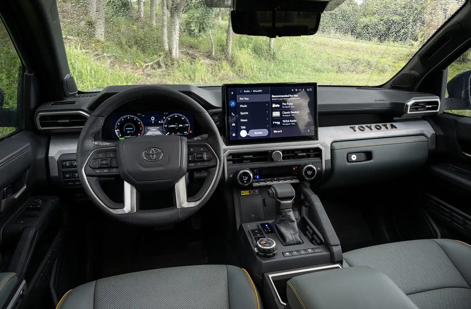 The all-new Tacoma is filled with the latest technology and information screens that bring significant updates to the cabin. A new 8-inch or available 14-inch multimedia touchscreen displays Toyota’s latest Audio Multimedia system that debuted on the 2022 Tundra pickup and is designed and engineered by Toyota’s Texas-based Connected Technologies team. The system supports wireless Apple CarPlay® and Android Auto™ compatibility, and pairs well with the available Qi wireless charging pad with enhanced power output. A USB-C data and charging port is integrated on the right side of the display, and dual USB-C charging ports are included in the front row and available for the rear passengers. A 12.3-inch digital gauge cluster with four different styles is standard on higher grades while a 7-inch gauge cluster is standard on lower grades.