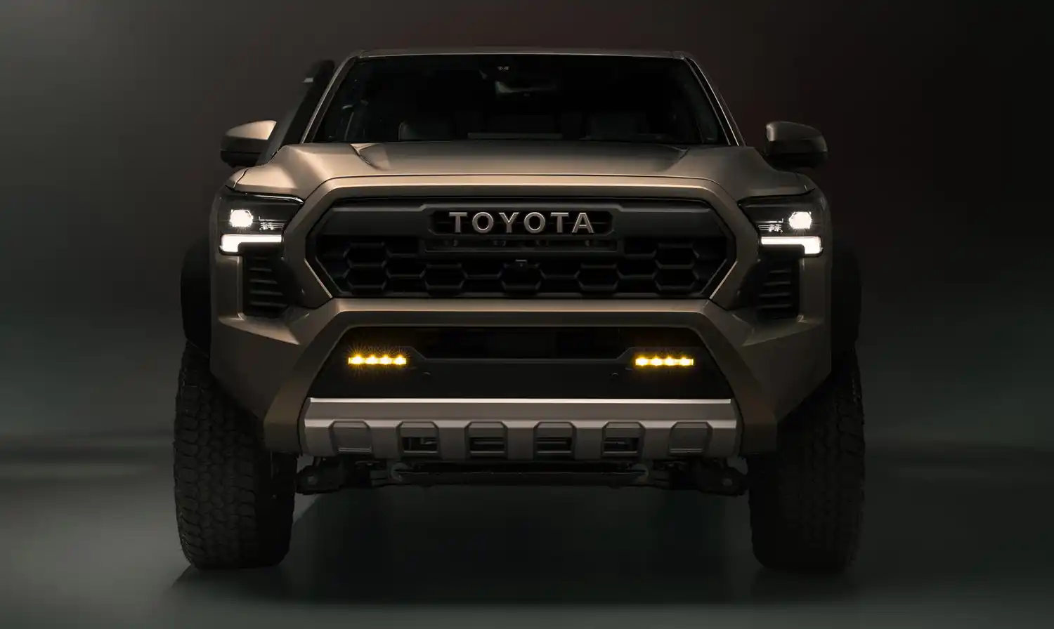 The CALTY team of designers focused on the theme of a “Badass Adventure Machine” when defining the essence of the new Tacoma. This refers to Tacoma’s engineered toughness along with its athletic attitude. The design team strives for Toyota trucks to have a family resemblance, each with unique personalities defined by each one’s purpose. For Tacoma, its narrow body and wide upper grille are a nod to the original HiLux, with features like the aggressive skid plates expressing the extreme ruggedness of Tacoma. Other signature design elements include the high-mount headlamps, side functional air intakes, hexagonal grille motif, as well as integrated roof and tailgate spoilers.