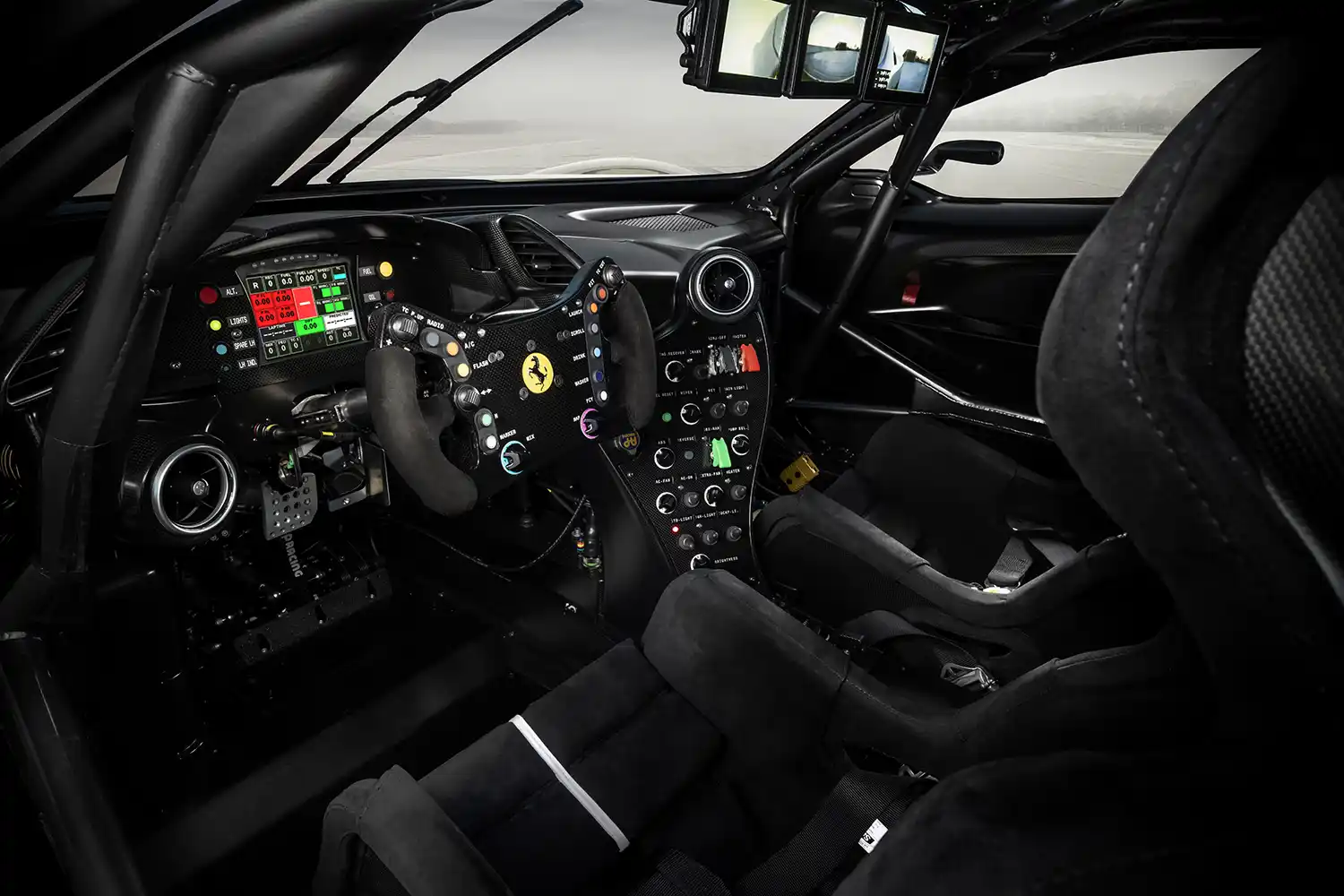 The cabin has been kept as pared-back and similar to the 488 GT3 Evo 2020 as possible, with the exception of the door panels and dashboard finish on the passenger side. The KC23’s specific seats, trimmed in Alcantara® with an electro-welded logo, lend the cabin an elegance that is perfectly in tune with the exterior. Rearward visibility is ensured by a video camera system that also had a beneficial impact on the car’s aerodynamics, as the traditional wing mirrors could be removed and the line of the flanks left unsullied.