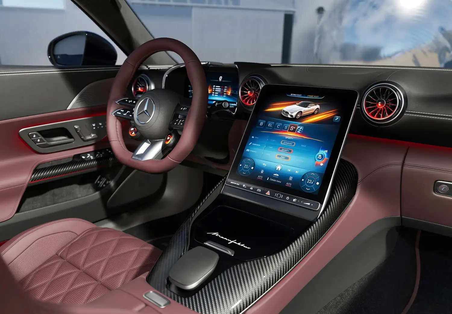 The active aerodynamics were also fine-tuned. It is adapted to electrified drive technology. The active aerodynamic element, which is hidden in the underbody in front of the engine, contributes to balanced driving behaviour. It is standard on the SL top model. This carbon profile is an exclusive AMG development and protected by patents. It reacts to the position of the AMG driving programmes and automatically extends downwards by around 40 millimetres at a speed of 80 km/h. This creates the so-called Venturi effect, which additionally sucks the car onto the road and reduces the lift on the front axle.