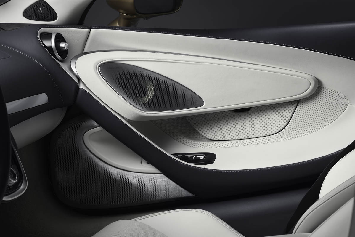 Designed to minimise weight and maximise interior space, the bespoke system is also optimised to deliver the best possible acoustic performance within the McLaren GT’s unique cabin architecture. A speaker integrated at the top of the dashboard drastically reduces diffraction for optimal clarity, while lightweight, highly advanced componentry such as Kevlar speaker cones and Neodymium magnets contribute to the cleanest possible performance throughout the entire sound spectrum.