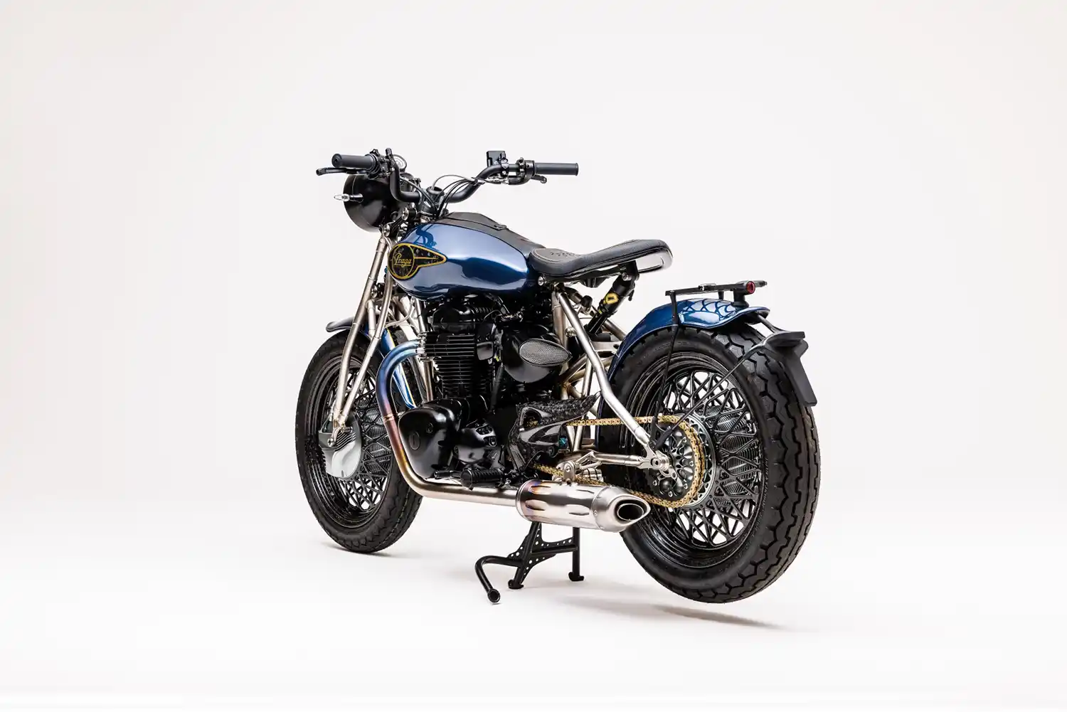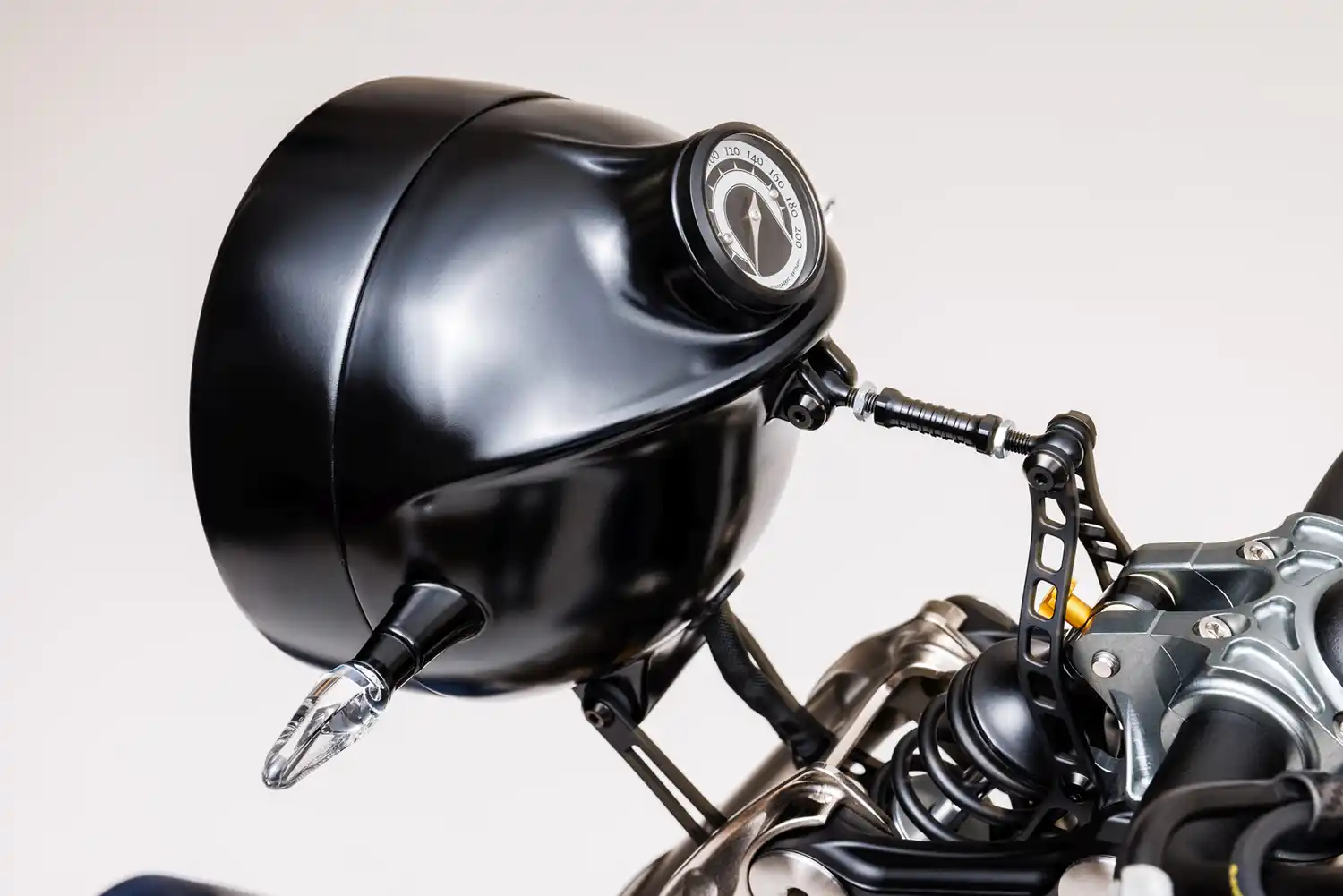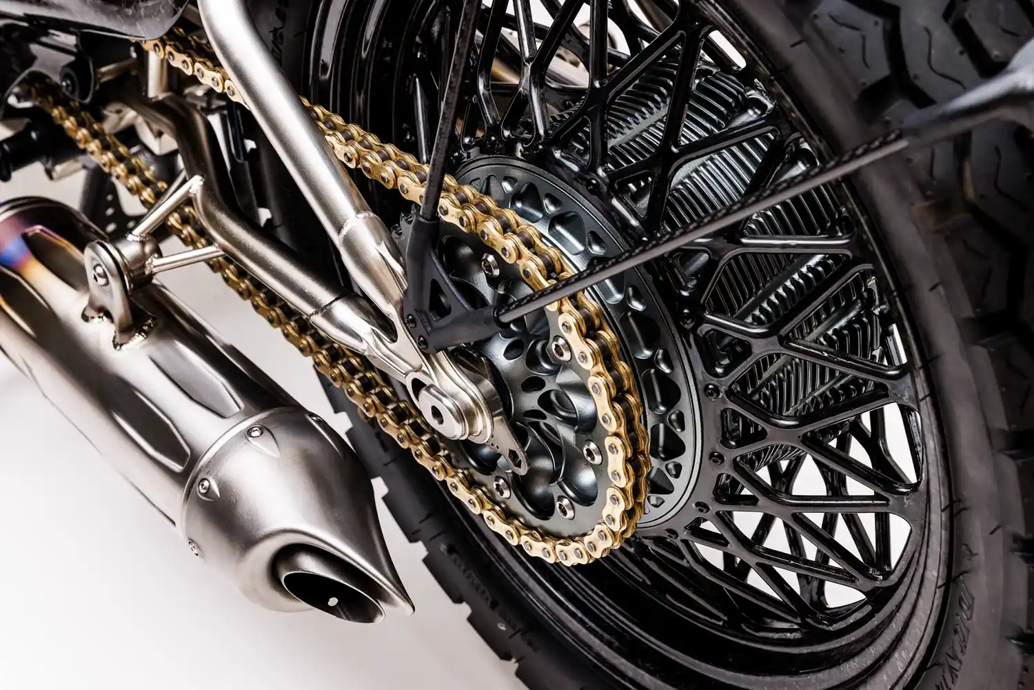 A sculpted front fork sits at the fore of the motorcycle; a structure only made possible through five-axis machining and chrome molybdenum steel. Nestled within the fork is fully adjustable Öhlins suspension with a titanium spring that effortlessly delivers a smooth and exclusive ride.