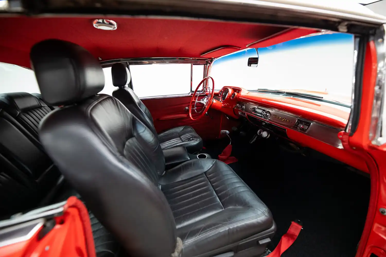 The interior of this 1957 Chevrolet Bel Air Hardtop has been tastefully upgraded for both comfort and style. It features power bucket seats upholstered in leather, providing excellent support and a luxurious feel. A center console with cup holders adds modern convenience. The flooring has been redone with new black carpeting, and the headliner is finished in a striking red, complementing the exterior color. The door panels have been sculpted, adding a touch of custom elegance to the interior. For fuel delivery, a Tanks fuel tank with an internal pump has been installed, ensuring reliable fuel supply for the modern engine. Entertainment is provided by an in-dash AM/FM/Cassette radio, while under-dash gauges offer additional information about the car’s performance. The car rides on polished 18-inch American Racing Torque Thrust wheels fitted with radial tires, combining classic styling with modern handling and ride quality. This 1957 Chevrolet Bel Air Hardtop is a masterful blend of iconic vintage design and modern performance upgrades, creating a truly unique and desirable classic.