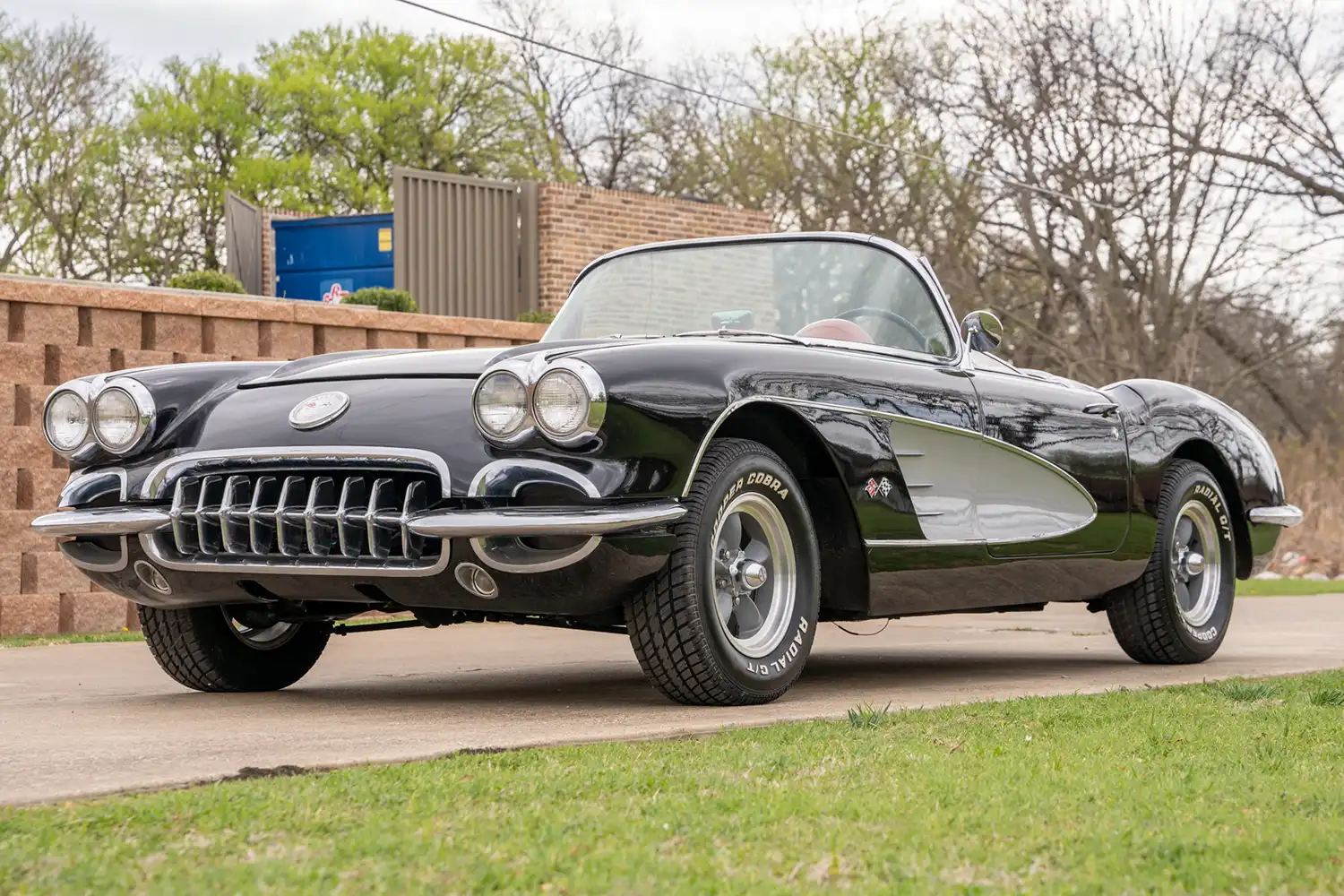 This 1960 Chevrolet Corvette convertible presents an opportunity to own a classic American sports car with some desirable upgrades. Powered by a 283ci V8 engine paired with a Turbo Hydramatic three-speed automatic transmission, this C1 Corvette has been refinished in black with silver coves over a red vinyl interior. While it boasts features like 14-inch American Racing Torq Thrust wheels, power-assisted front disc brakes, and an Edelbrock four-barrel carburetor, it also requires attention to several cosmetic and functional areas. Reportedly spending time in California before relocating to Texas in 2006, it was recently acquired by the selling dealer in 2025 and is offered at no reserve with a clean Texas title.