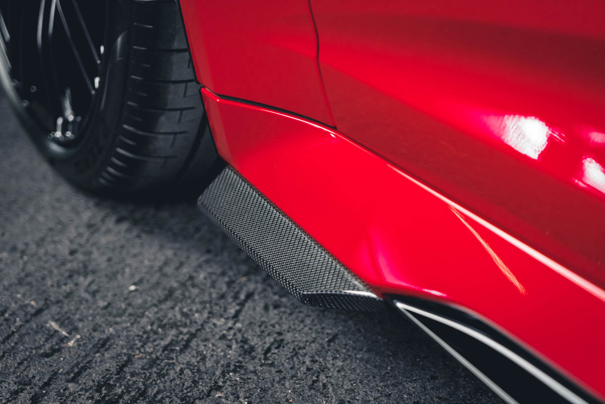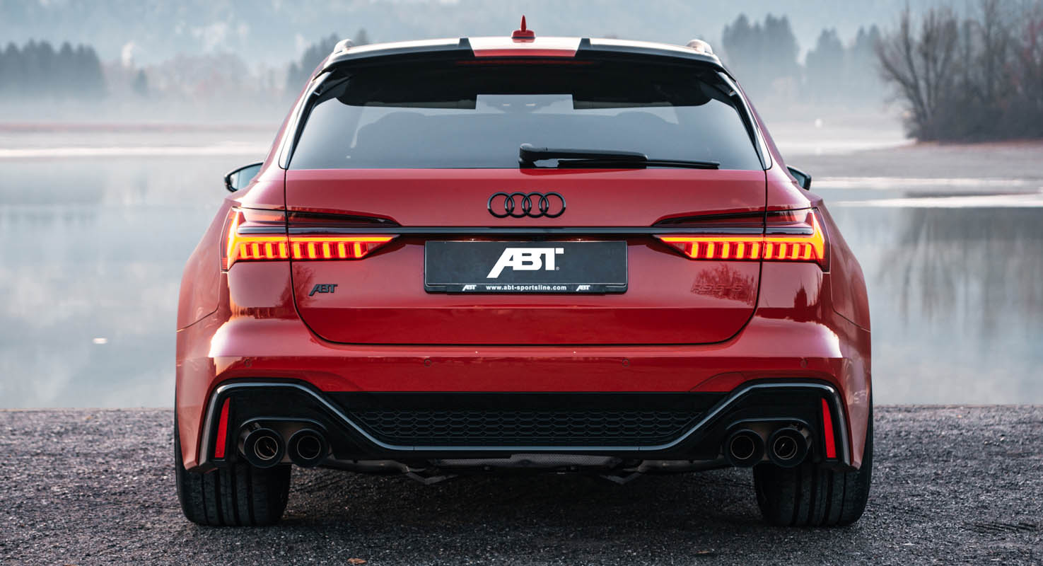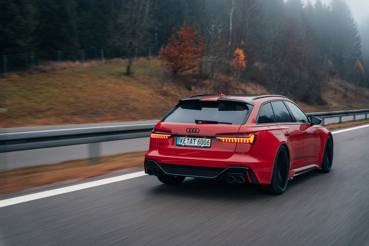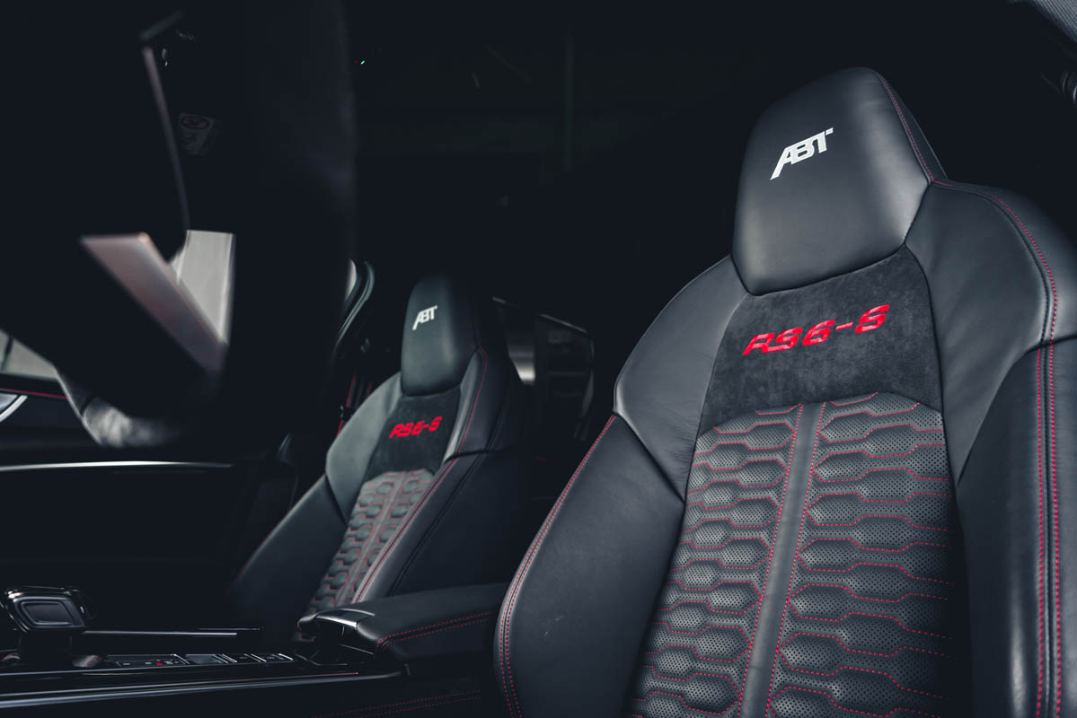 These values are matched by the extensive aerodynamics package made of “motorsport-like” visible carbon, which has many similarities for both vehicles, but also interesting differences. For example, both kits include a striking frontlip with the respective model’s name – RS6-S or RSQ8-S – in red lettering. While the SUV gets ABT side skirt add-ons at the front and rear, the Avant has side skirt add-ons at the front and sideblades at the rear. The two-part rear spoiler, which can be found on both S models, immediately provides the next wow. Just like the ABT stainless steel exhaust system with its four 102 mm tailpipes, it underlines the dynamic appearance of the vehicle.