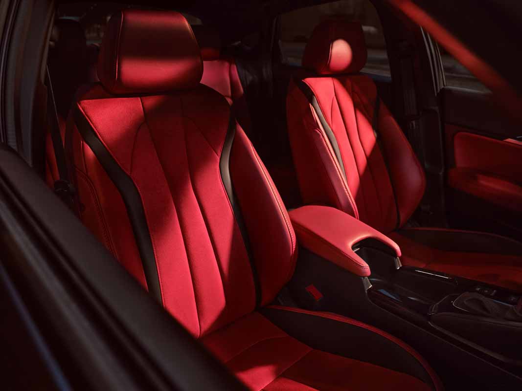 Standard on the 2023 Acura Integra are new body-stabilizing and heated front seats wrapped in synthetic leather, with 8-way power adjustment for the driver, available in either Ebony, Red or Orchid. The optional Technology Package adds a 12-way power seat (includes lumbar support) for the driver (4-way for the front passenger) as well as microsuede inserts for the front seats.