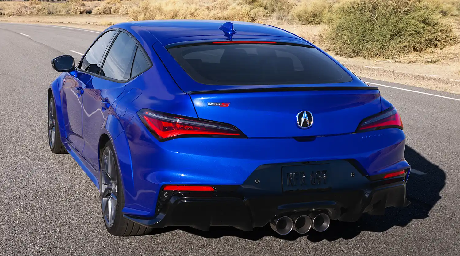 A redesigned rear fascia reveals three large center-mounted exhaust outlets, a first for a Type S model. A new gloss black diffuser and a decklid spoiler intensify downforce.