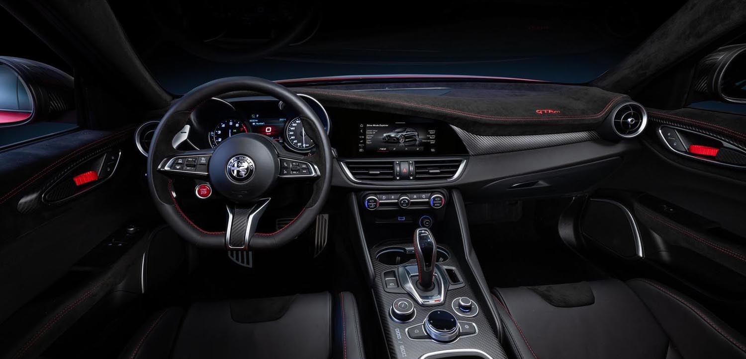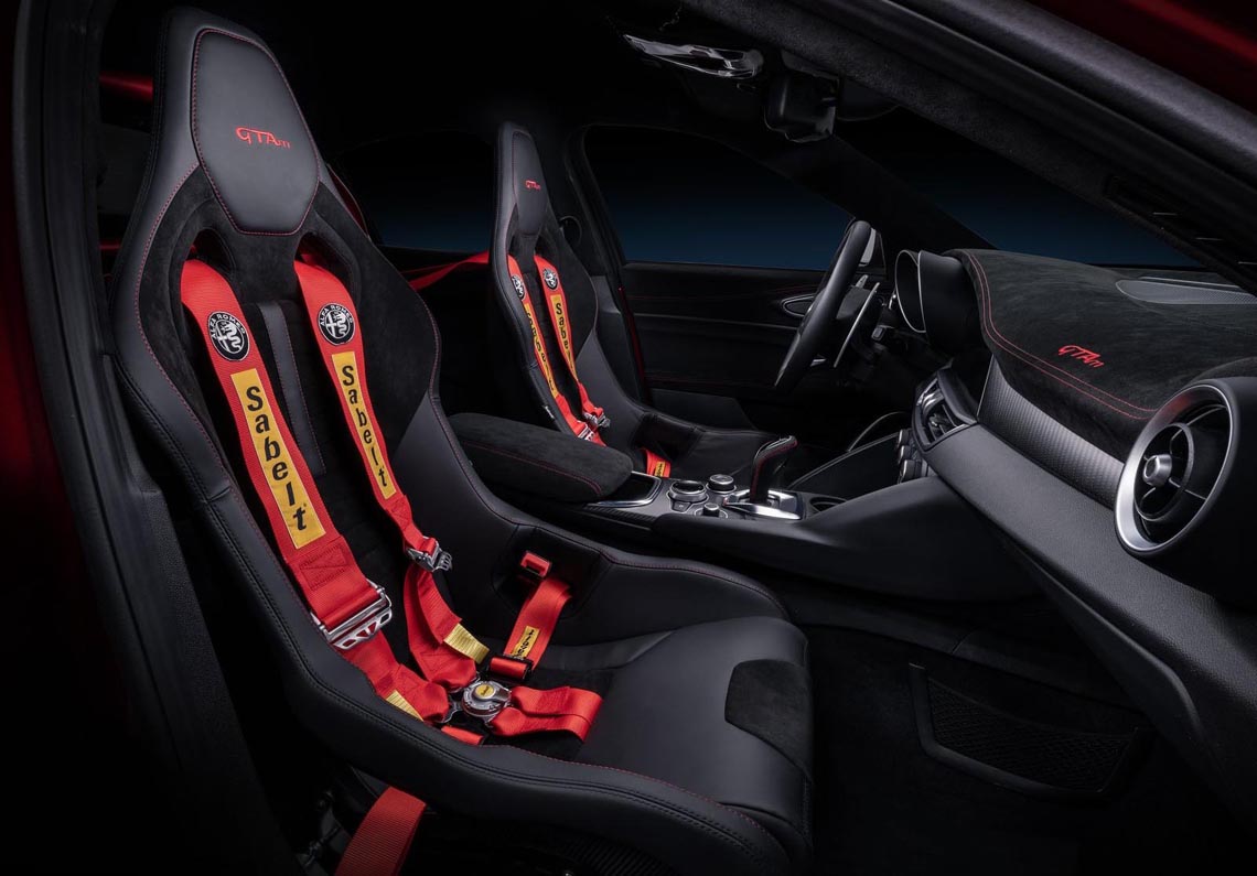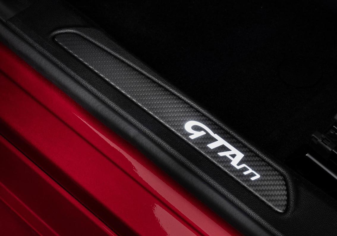 Moving inside the car, several new details stand out: the trim in 100% Alcantara® on the dashboard, door panels, glove compartment, side pillars and the central trim on the seats. Alcantara® is used even more extensively on the GTAm version, where the rear bench has been removed, leaving room for a fully upholstered “basin”, hosting specific moldings deigned to hold helmets and fire extinguisher. The new matte carbon inserts endow the interior with a distinctive technical and aesthetic elegance. In the new GTAm, the interior is unique in that it features a roll bar, no door panels or rear seats and the door is opened with a belt in place of the handle, another touch that comes from the racing world.