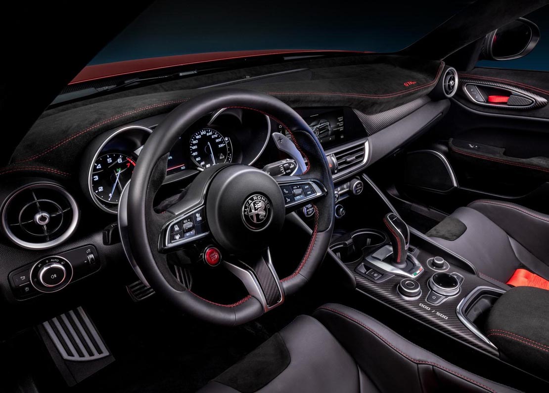 For the new Giulia GTA, Alfa Romeo engineers have striven to improve aerodynamics and handling but above all to reduce weight: the same guidelines followed for the 1965 Giulia GTA. The active aerodynamics were specifically studied to increase the downforce. These solutions contain technical know-how that comes directly from Formula 1, thanks to the synergy with Sauber Engineering and the use of the Sauber Aerokit. The same task is assigned to the side skirts, the specific rear spoiler and the active front splitter. The titanium Akrapovi? central exhaust system integrated in the carbon fiber rear diffuser is also new, as are the 20-inch center lock wheels, appearing for the first time on a sedan. The handling at high speeds has been improved by widening the front and rear wheel tracks by 50mm and developing a new set of springs, shock absorbers and bushings for the suspension systems. On GTAm, the aerodynamic front piece has been optimized to an extreme level, by adding a larger front splitter and a real carbon rear wing, which ensure a perfectly balanced load at high speeds. In terms of performance, the powerful 2.9 V6 Bi-Turbo, made entirely of aluminum and capable of unleashing no less than 510 hp in the standard configuration, reaches a power output of 540 hp on Giulia GTA, thanks to meticulous calibration work performed by Alfa Romeo engineers. The same team has also succeeded in optimizing the implementation of the new Akrapovi? specific exhaust system, with its unmistakable sound.