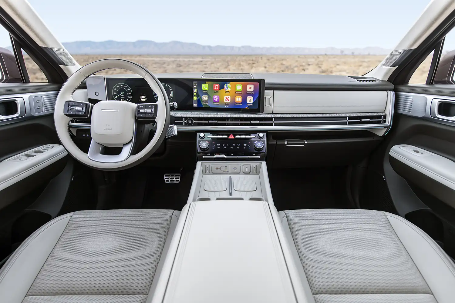 The new interior design also benefits from available convenience features, such as a new UV-C sterilization compartment and a dual, wireless charging system (15W) for smartphones for a sophisticated user experience. Santa Fe’s first-in-class Panoramic Curved Display, which encompasses the 12.3-inch digital gauge cluster and infotainment system, enhances driving visibility while adding a premium ambience.