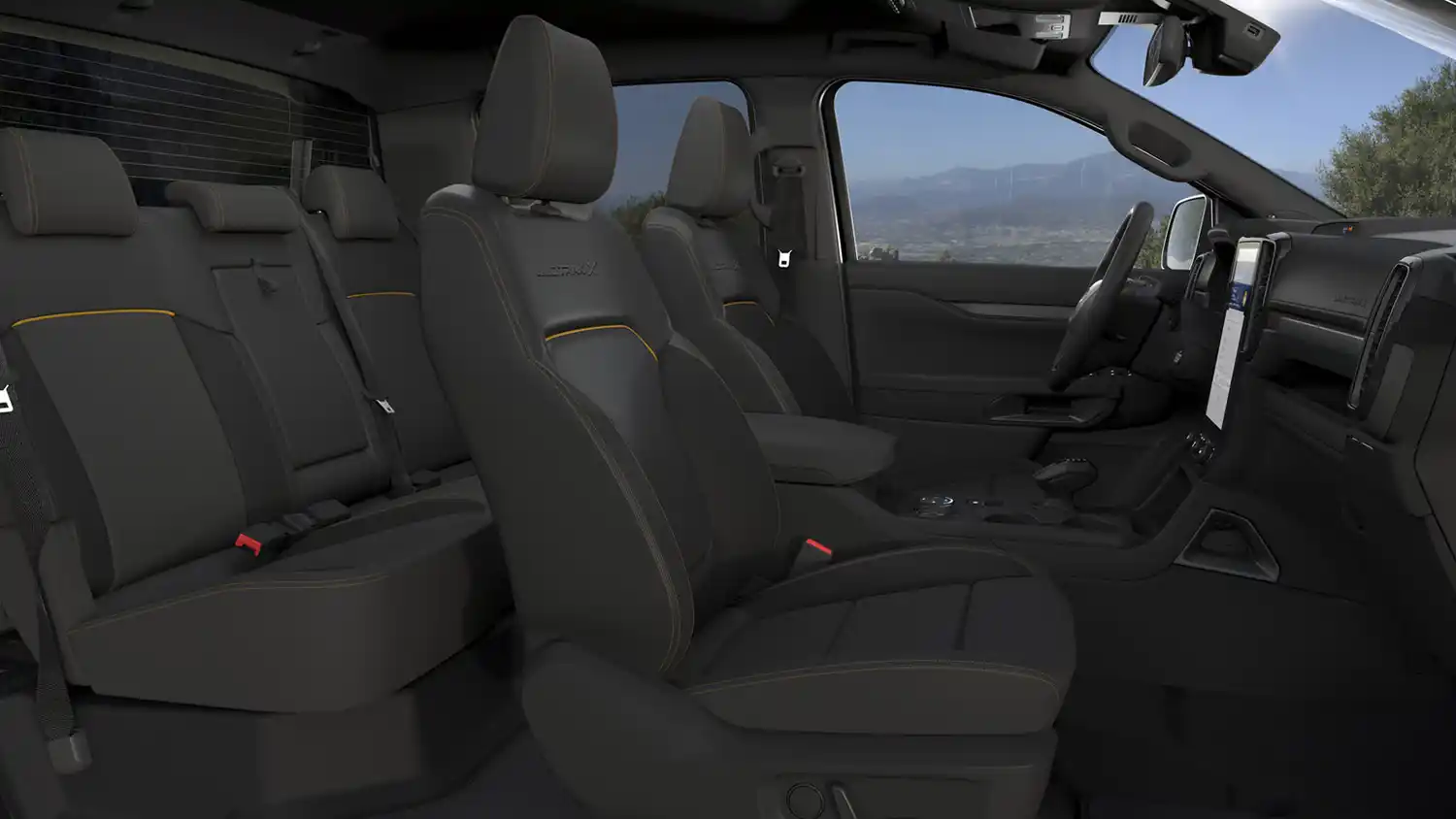 Inside, occupants benefit from unique Miko suede-trimmed seats with exclusive Wildtrak X embroidery, supported by soft-touch Terra suede with contrast Cyber Orange stitching on the upper dashboard, door trims and centre console. Built-in connectivity as standard to FordPass 6 and Ford Pro services such as FORDLiive enhance the ownership experience.