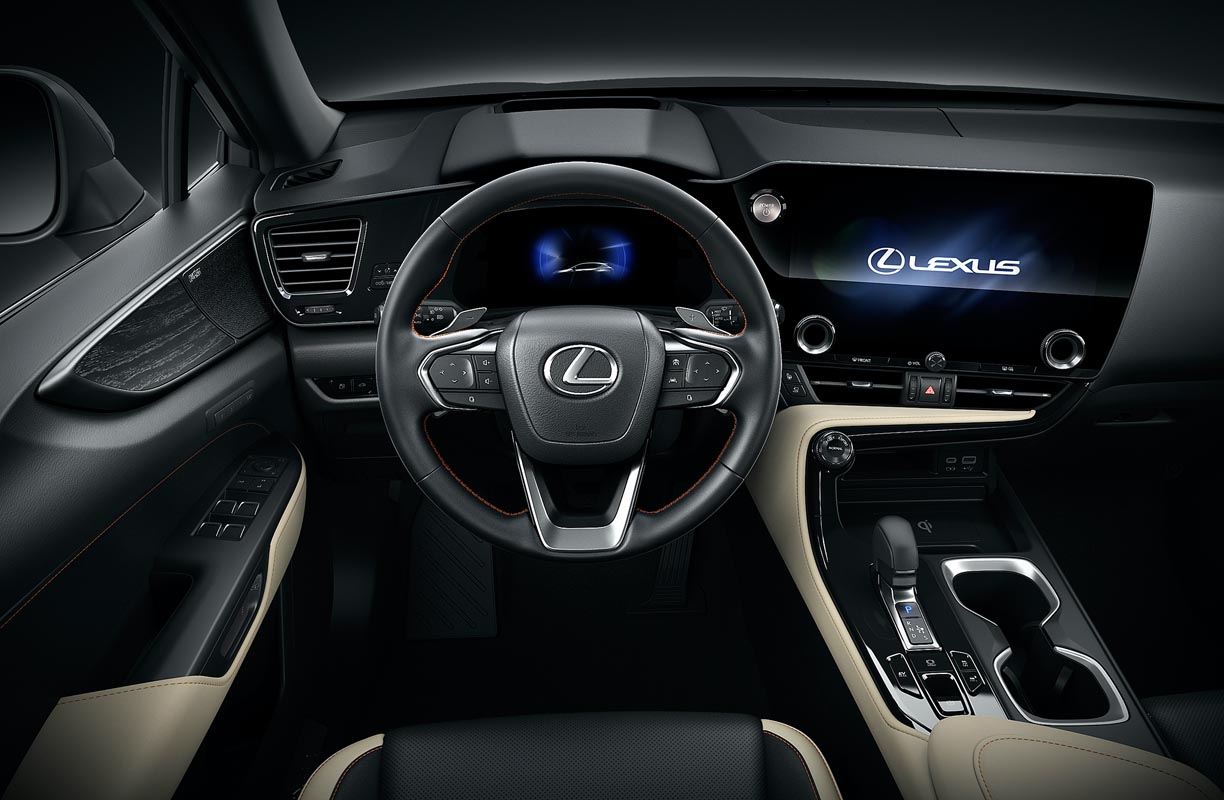 Both the NX F Sport and NX Sports Luxury feature the ultimate Tazuna cockpit concept with an expansive 14.0-inch touch-display, a panoramic view monitor, wireless smartphone charging3, touch-sensitive steering wheel controls and a colour head-up display.