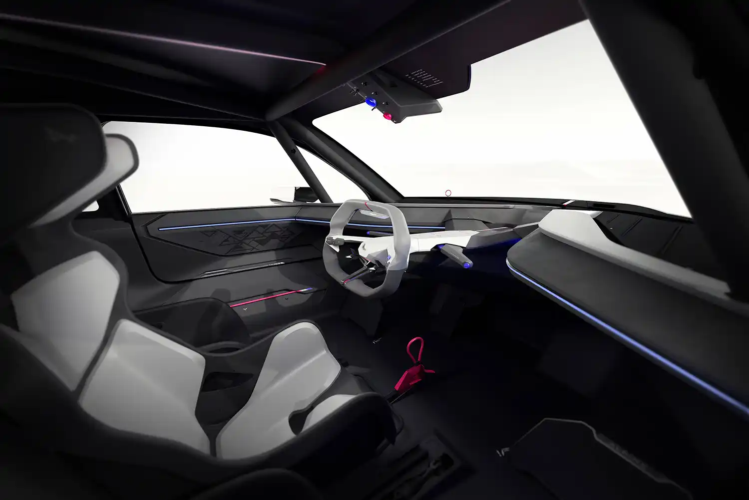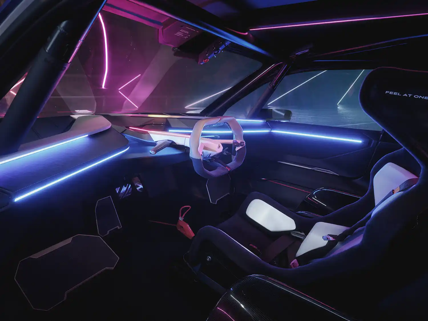 The cockpit is inspired by racing cars: it is minimalistic and all about performance and efficiency. The steering wheel packed with an assortment of motorsports-inspired features is a great example and the bucket seats and safety harness round out the effect.