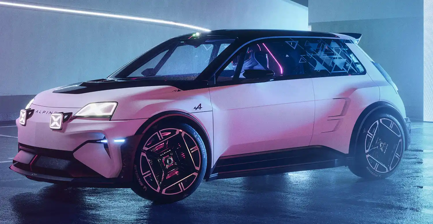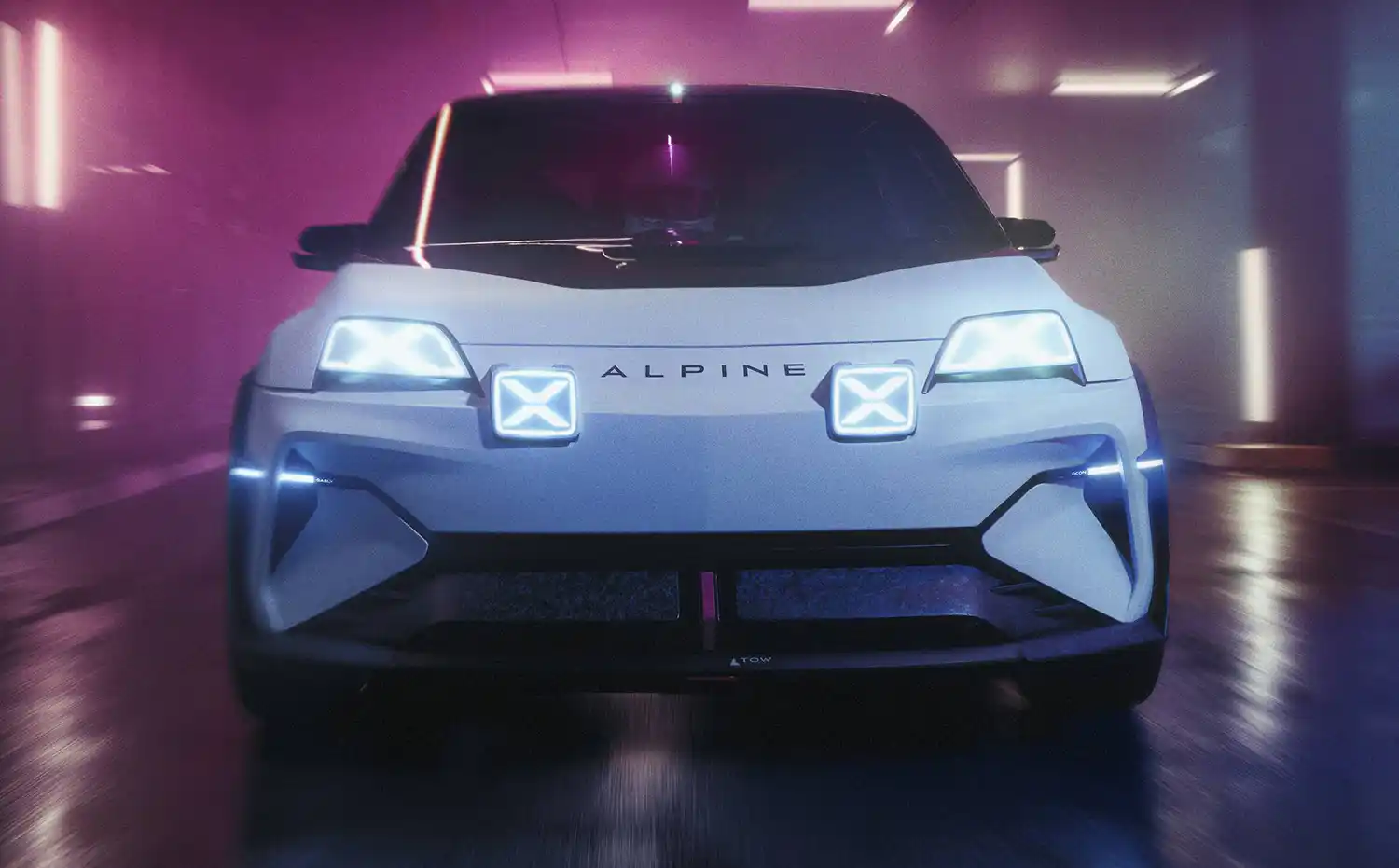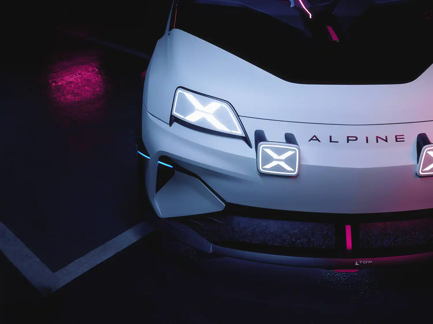 The name Alpine is written in metallic letters across the sides and front. Blue, white and magenta flags replicate the show car’s colour scheme and underline its identity.