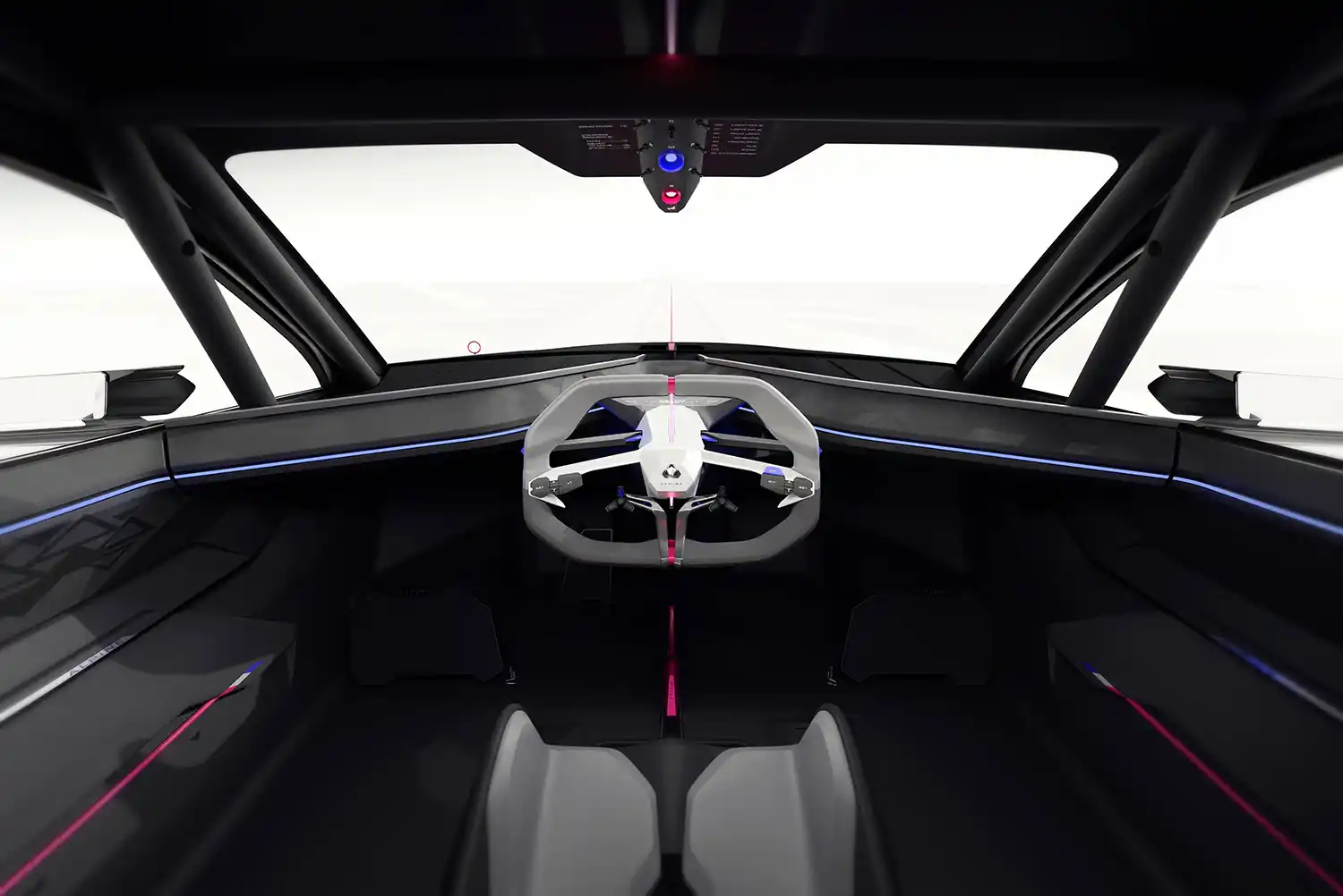 While the production car will look a lot like the Alpine A290_β from the outside, the interior is much more conceptual and based on a pioneering architecture that puts the driver in the middle of the action. Two magenta and blue light beams also underline the fact that the driver’s seat is on the centreline.