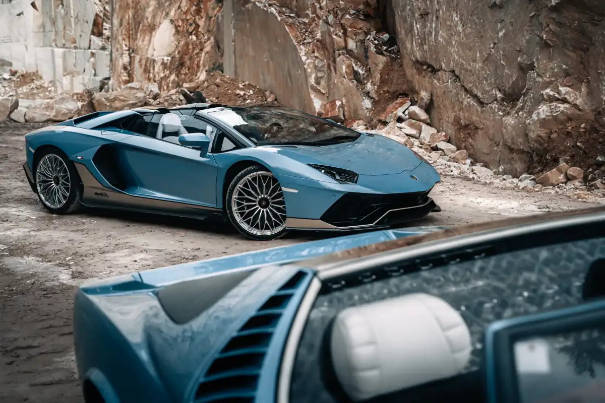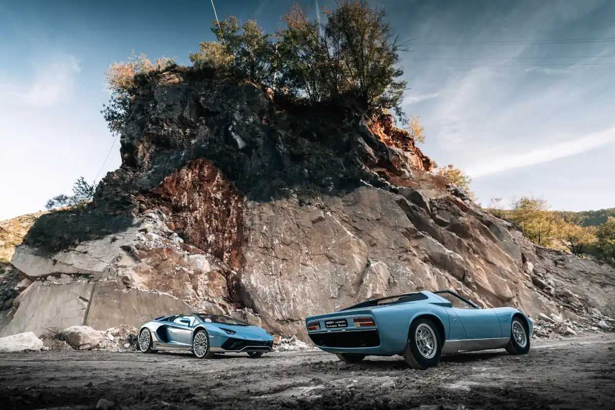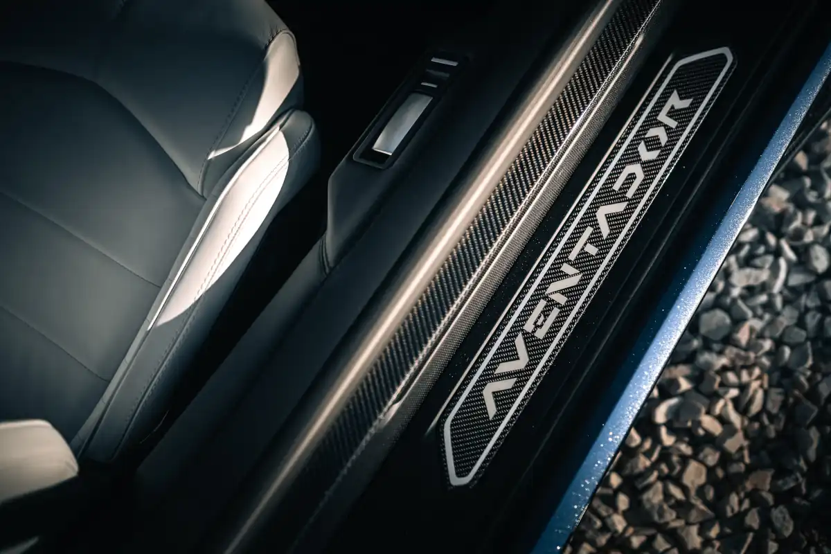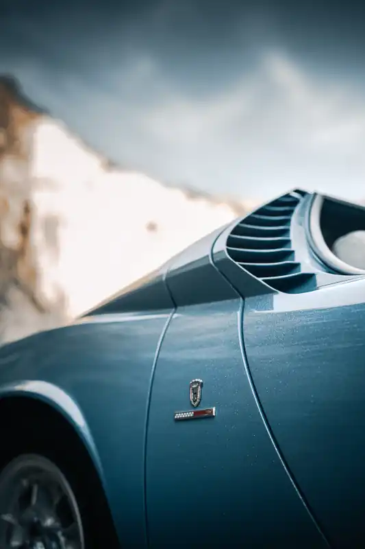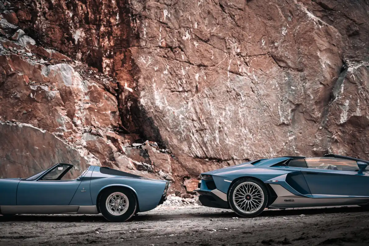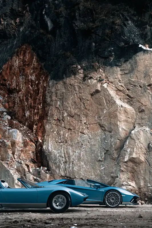 The Ultimae’s body color is in a specially created color Azzuro Flake, replicating the original special color of the Miura while updating the glitter element for homologation purposes. The rocker cover is in Grigio Liqueo with a Nero Aldebaran pinstripe, extending from front to rear of the Aventador and complementing the visible carbon fiber of the sill, front splitter and rear diffuser. The roadster’s roof and rear engine cover are in shiny, black-painted carbon fiber, reminding that the original Miura Roadster is roofless. Black air intakes and additional Nero Aldebaran livery on the Aventador’s bonnet emulate the Miura’s black-painted bonnet scoop; the tailpipes are matt black; and the Ultimae’s rims in shiny silver with black brake calipers reflect the Miura’s original silver rims.