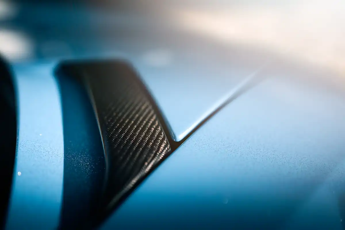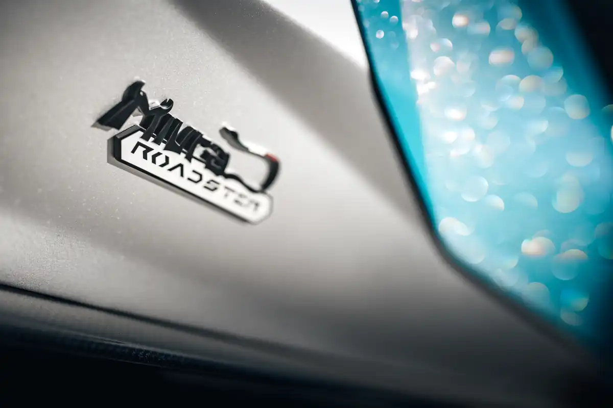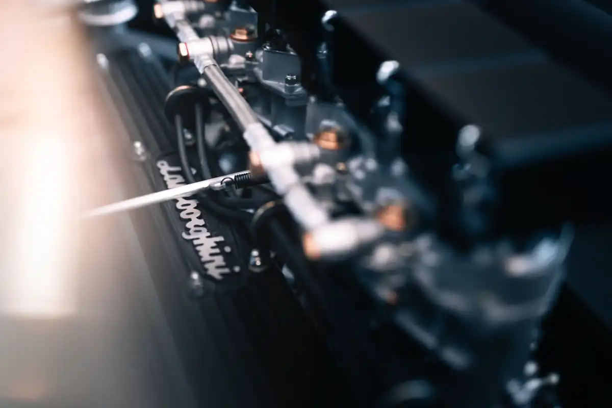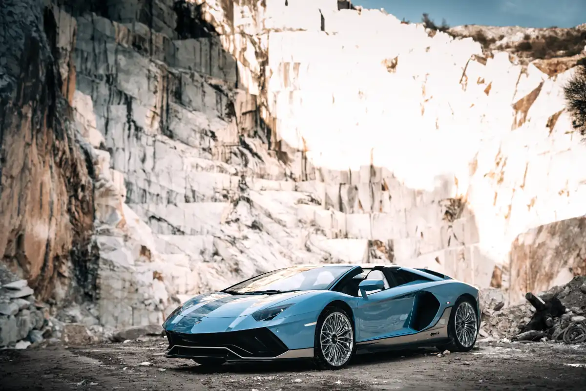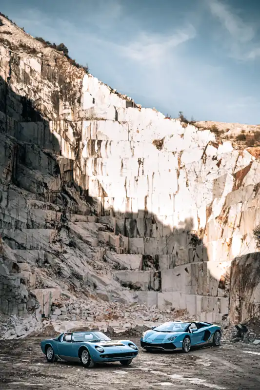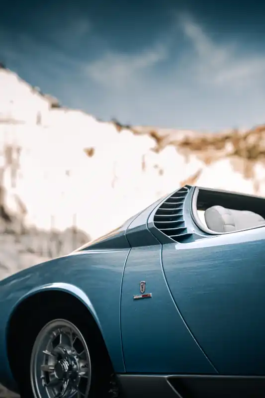 The Ultimae’s body color is in a specially created color Azzuro Flake, replicating the original special color of the Miura while updating the glitter element for homologation purposes. The rocker cover is in Grigio Liqueo with a Nero Aldebaran pinstripe, extending from front to rear of the Aventador and complementing the visible carbon fiber of the sill, front splitter and rear diffuser. The roadster’s roof and rear engine cover are in shiny, black-painted carbon fiber, reminding that the original Miura Roadster is roofless. Black air intakes and additional Nero Aldebaran livery on the Aventador’s bonnet emulate the Miura’s black-painted bonnet scoop; the tailpipes are matt black; and the Ultimae’s rims in shiny silver with black brake calipers reflect the Miura’s original silver rims.