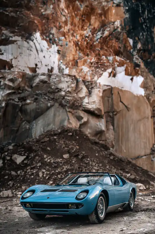 The Miura P400 Roadster that has inspired the very last V12 Aventador, was a one-off show car unveiled at the Carrozzeria Bertone stand at Brussels Motor Show in April 1968. More than simply the coupé with the roof removed, the Roadster sports several differences to deliver the most aesthetic solution and ensure the necessary torsional rigidity of the chassis. It was painted in a spectacular, and very shiny, Lamè Sky Blue Acrilico paint, on Pelle Bianco interior paired with red carpet. With a low roofline, large side air intakes and a sharply-raked windscreen and all other glass removed, the Roadster was well-received but never entered production. After also being shown at the 1968 Geneva Motor Show the show car, after being test-driven in Sant’Agata Bolognese, returned to Bertone and was sold to the International Lead and Zinc Research Organization (ILZRO) who replaced every possible component with zinc or lead and repainted in olive green with green interior. It was used as a demonstration show car and renamed ZN 75. It travelled the world promoting the lead and zinc materials, and was shown to several car design centers. The rust protective zinc treatment, still now considered mandatory on every new car, can be directly related to the work of the ZN 75. After different owners all over the world, the ZN 75 was returned to its original Roadster configuration in 2008. Fully restored to its original Brussels motor show condition, it was shown at the Pebble Beach concours d’élegance in 2008 where finished second in the Lamborghini class.