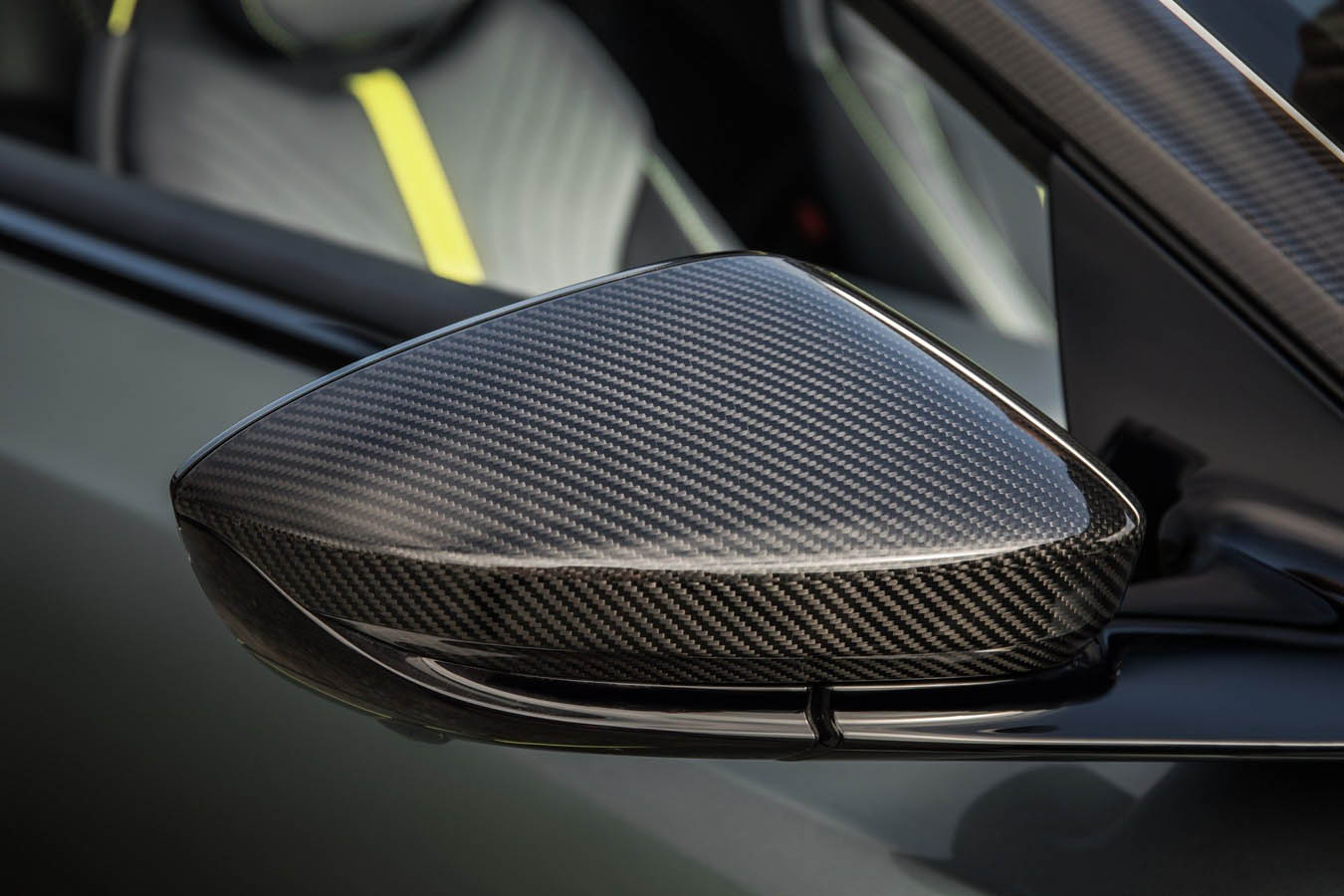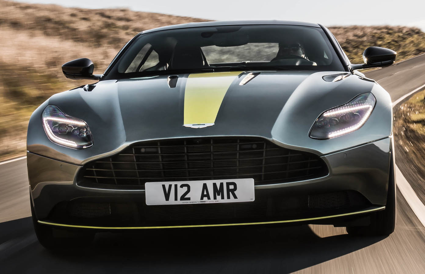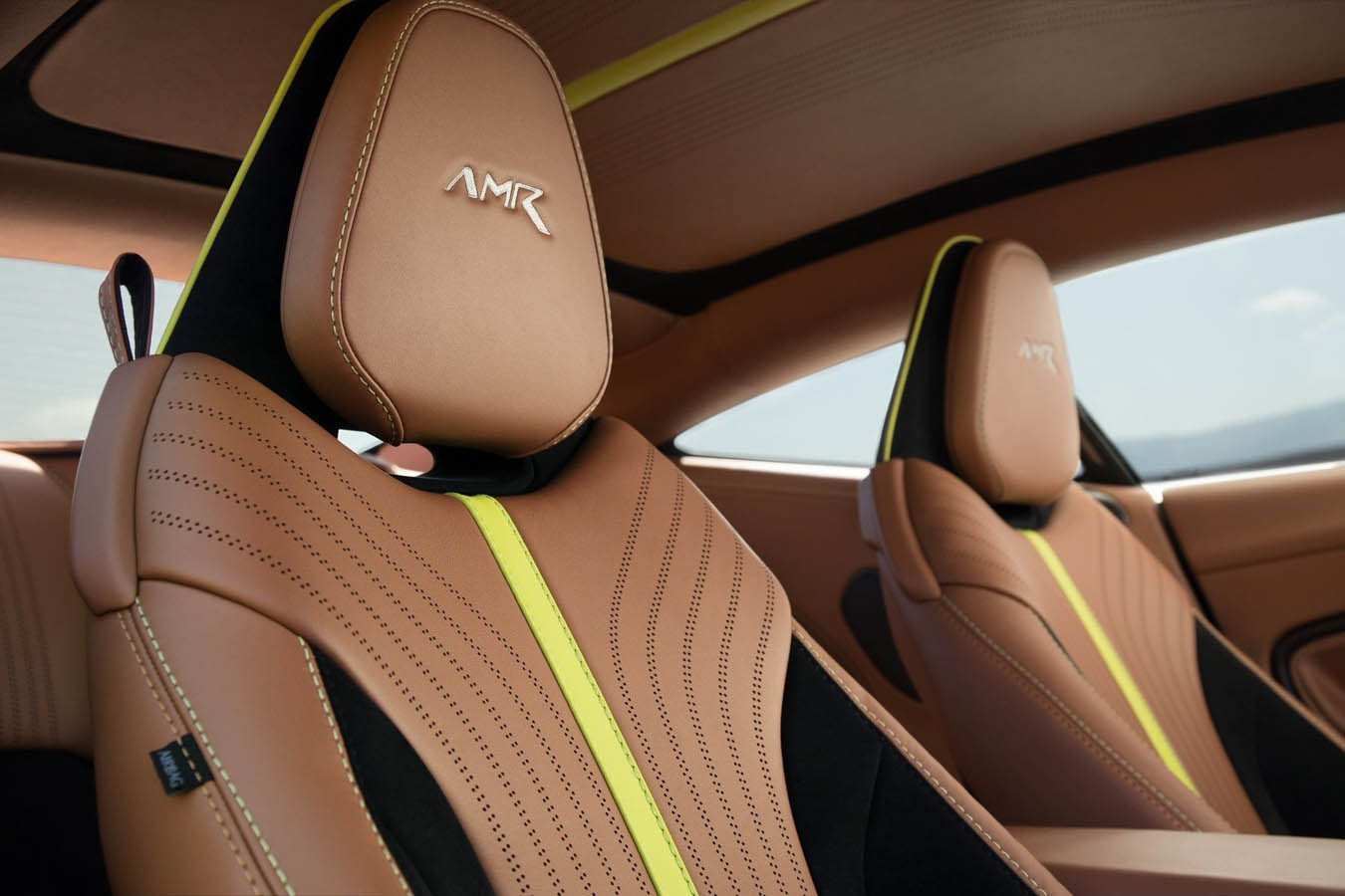 Visually the Aston Martin DB11 AMR is distinguished by a co-ordinated palette of exposed carbon fibre and gloss black detailing that unites the exterior and interior treatment. On the outside all brightwork has been given a monochrome treatment: dark headlight surrounds and smoked tail lamps complimented by dark front grille and tailpipes; gloss black roof, roof strake plus side sills and splitter offering a subtle contrast with the exposed weave of the carbon fibre hood blades and side strakes. The dark theme continues inside, with monotone leather and alcantara upholstery and a bold contrasting central lime stripe, while DB11 AMR is treated to a leather sports steering wheel as standard.