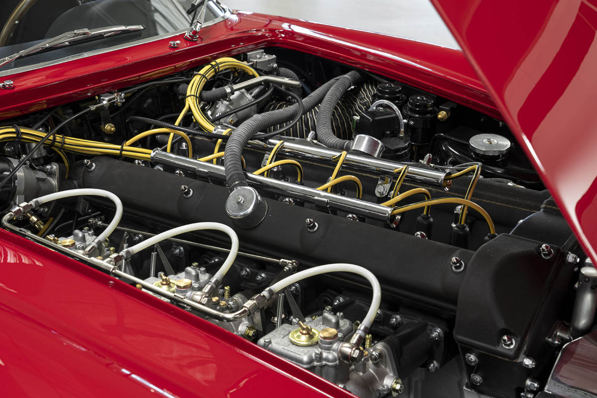 Finished in Rosso Maja red paint, the car’s exterior colour has been matched to original masters created by Max Meyer & ICI, the paint suppliers for the original cars. Inside, the car is trimmed in Obsidian Black leather, which covers the pads in the carbon fibre race seats; door cards, headliner and rear environment. Black Wilton carpets bound in Obsidian Black leather trim cover the floor, stitched in matching Obsidian Black thread.