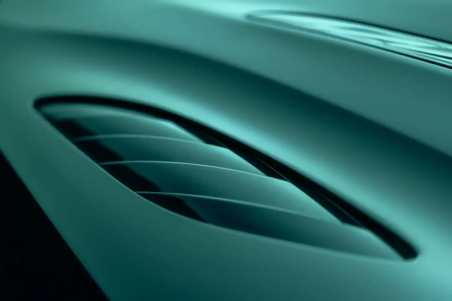 Being an Aston Martin, this enhanced form also had to possess an authentic level of function. Both to provide increased air flow to the radiators, enhancing thermal management and give greater visual road presence. Drawing increased air flow through the engine radiators, the clamshell bonnet features a dramatic ‘horse-shoe’ engine vent and a new front splitter integrates two new outboard vents. Together these serve to enhance cooling and echo the design signatures of previous DBS and V12 engine models.