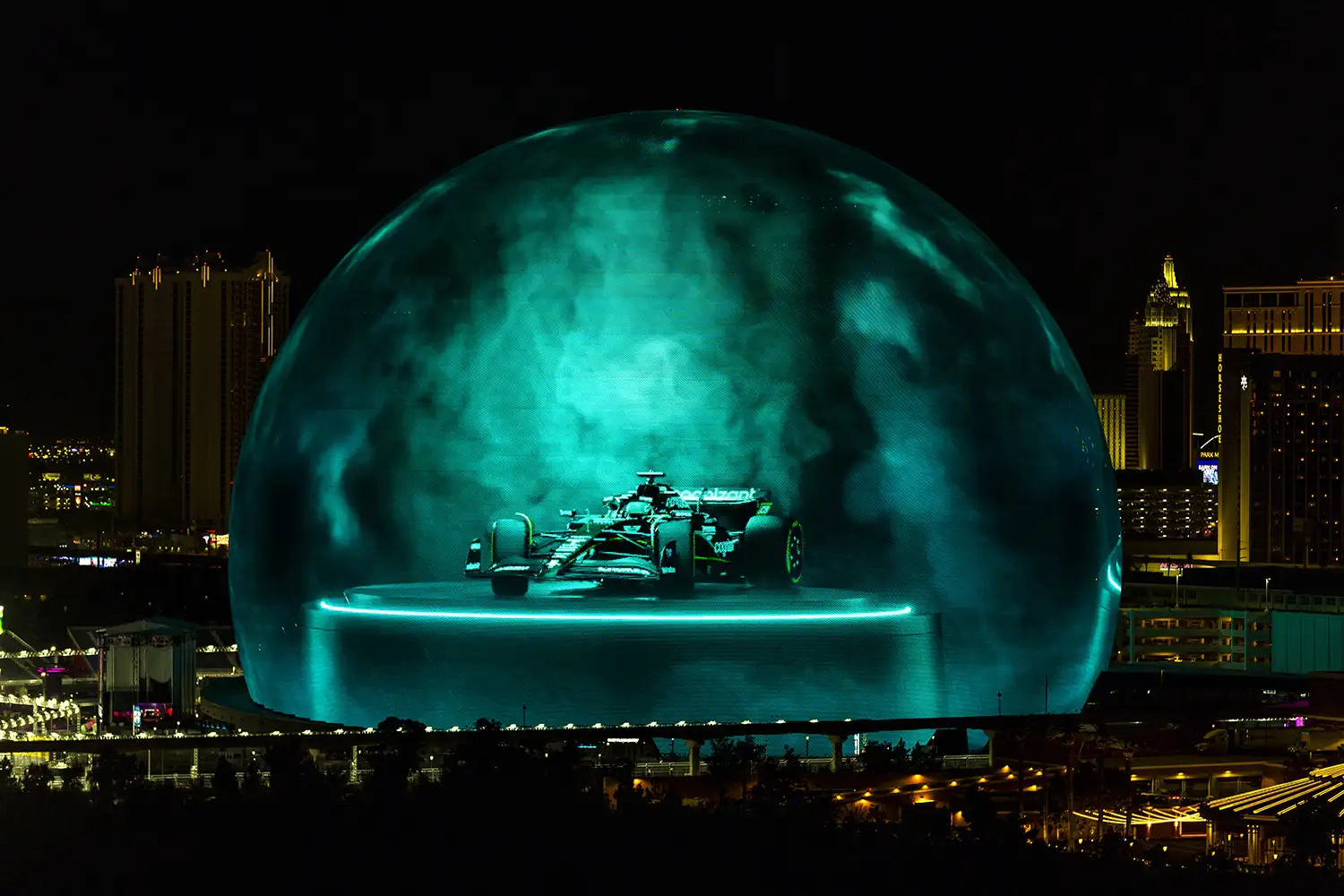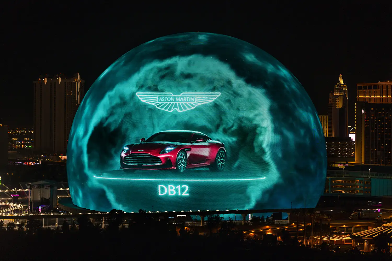 As part of Aston Martin’s Las Vegas Grand Prix partnership, Aston Martin debuted an immersive advertisement last night on the new Las Vegas landmark, Sphere, which has been developed over months by creatives challenged to bring the thrilling nature of the brand’s class leading performance cars to life.