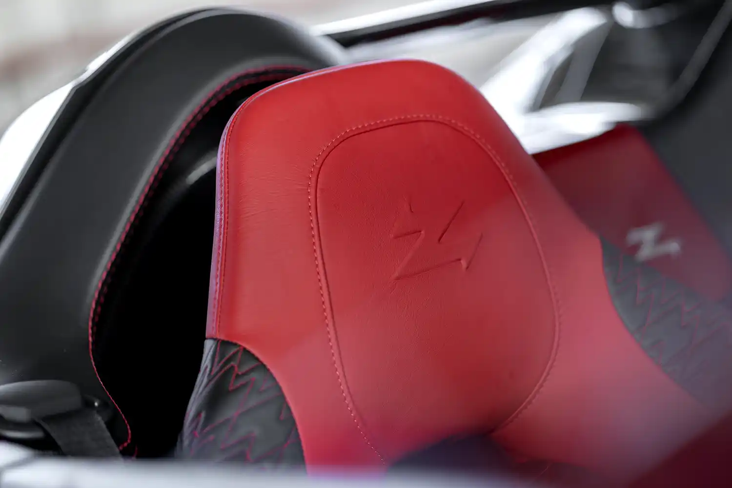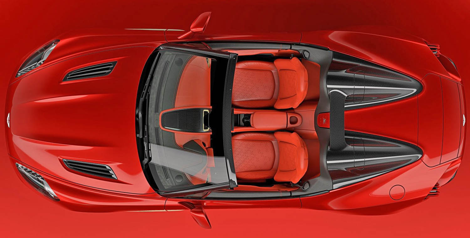 The Shooting Brake is still a strict two-seater, but one conceived as an individual and exceptionally practical GT. The extended roof on the concept sketch bears the iconic Zagato ‘double-bubble’ surfacing complete with glass inlays to let light flood into the cockpit. The sculptural roof culminates in a powered tailgate that opens onto a luxuriously trimmed rear cabin area, complete with a tailored luggage set. With dramatic herringbone carbon fibre facia with anodised bronze rotary controls, extensive ‘Z’ motif quilting and the option of a fully aniline leather upholstery, the Shooting Brake is a fitting complement to the Coupe, Volante and Speedster.