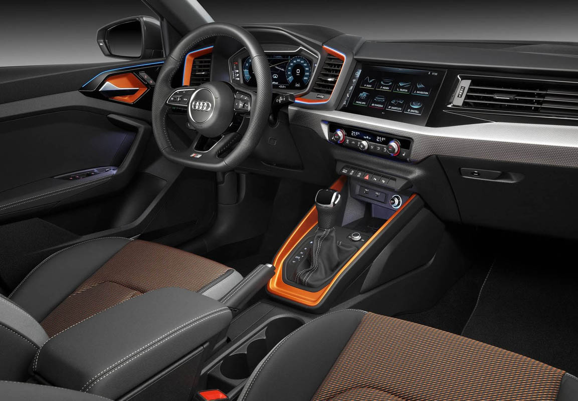 The exterior design of the Audi A1 citycarver is continued in the interior, with clear lines, taut surfaces and a high-quality finish. In the style of a racing car, the cockpit is literally built around the driver. The center console is tilted toward the driver, and the digital instrument cluster (standard) and its cover form a unit with the air vents. The MMI display (optional) and the air vent strip on the front passenger side are positioned on a surface with a black glass look, which extends all the way to the doors.