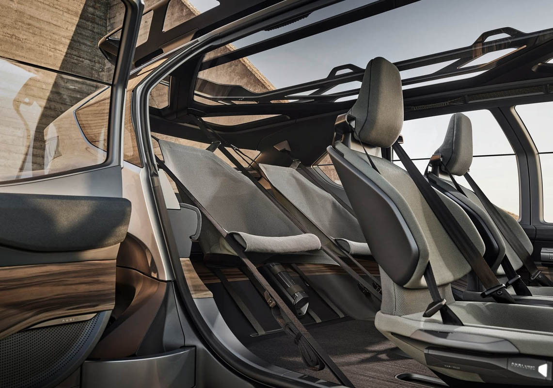 With the Audi AI:TRAIL, form follows function. In the interior, the side window ridges give passengers space where they objectively need it the most-around their shoulders and elbows. They also provide extra space where they subjectively perceive it most acutely, as the way in which the side windows extend down low opens up a clear down to the ground, even between the wheels. The aim of the designers here was to give those inside the vehicle the best possible view of nature and their surroundings, breaking the boundaries between the interior and the world outside. When the car is moving, the occupants’ gaze is not merely focused on the terrain ahead but is free to wander and happen upon little details in the open spaces around them. In the AI:TRAIL, passengers can relax and enjoy the tranquility of the ride without even having to think about it.