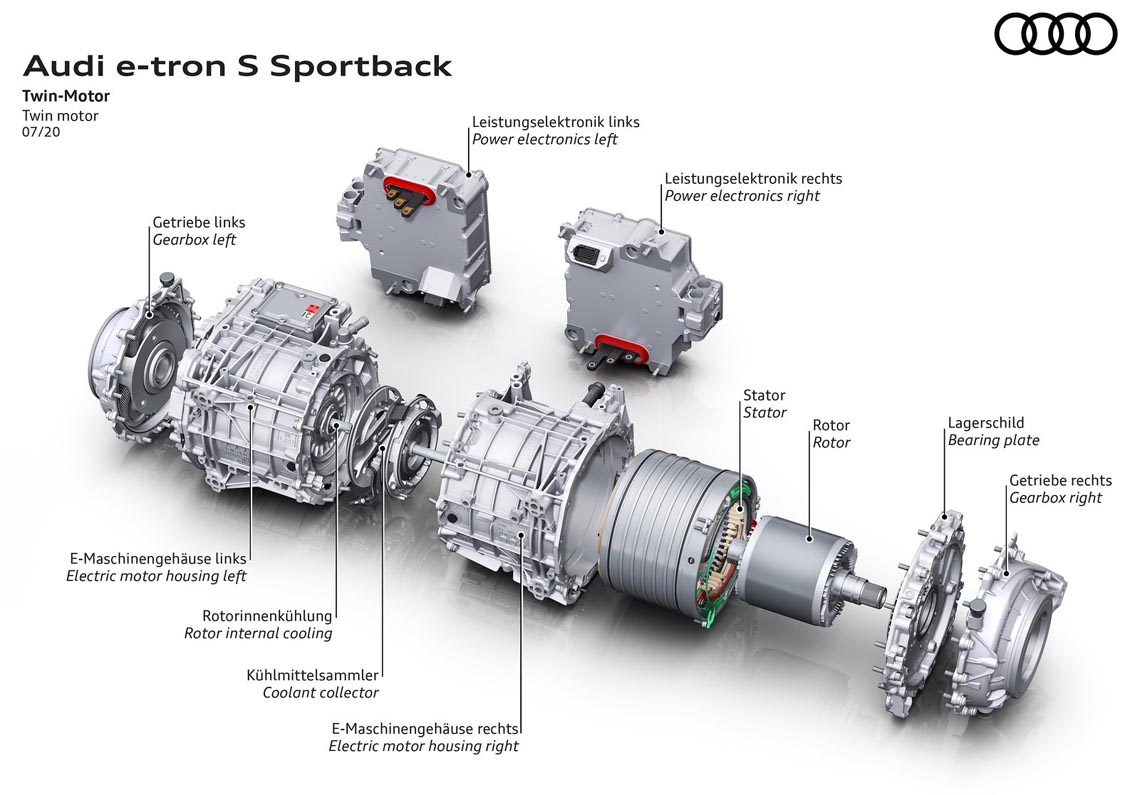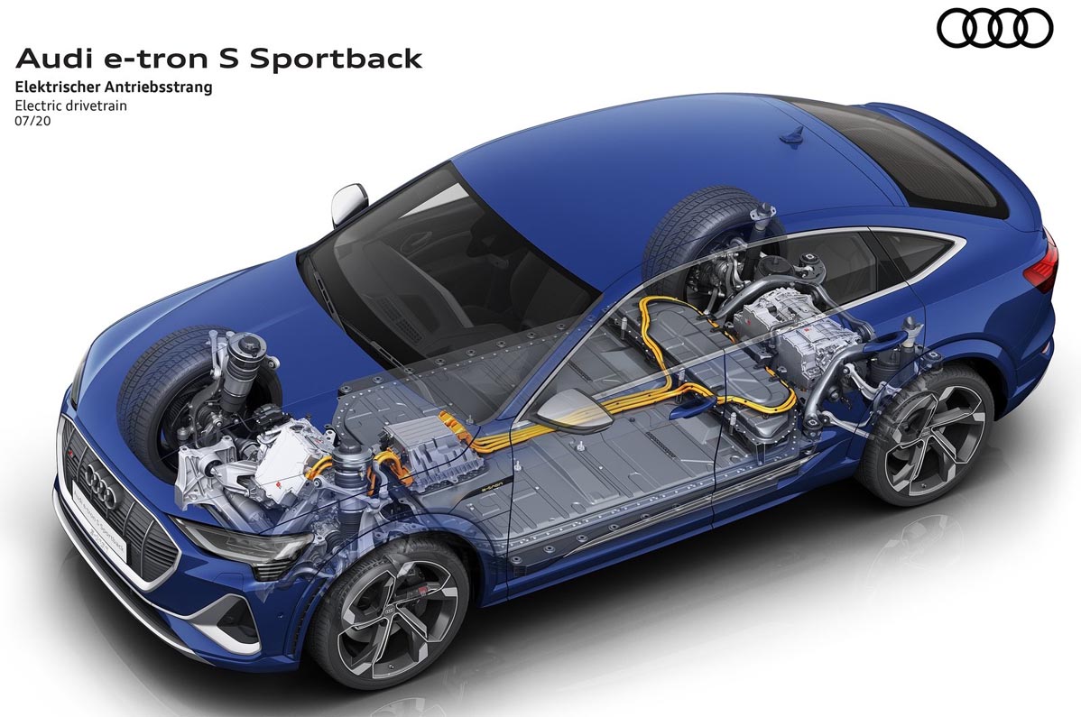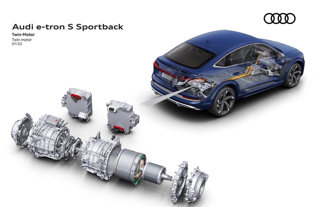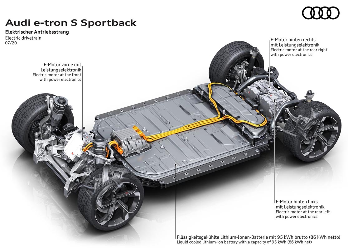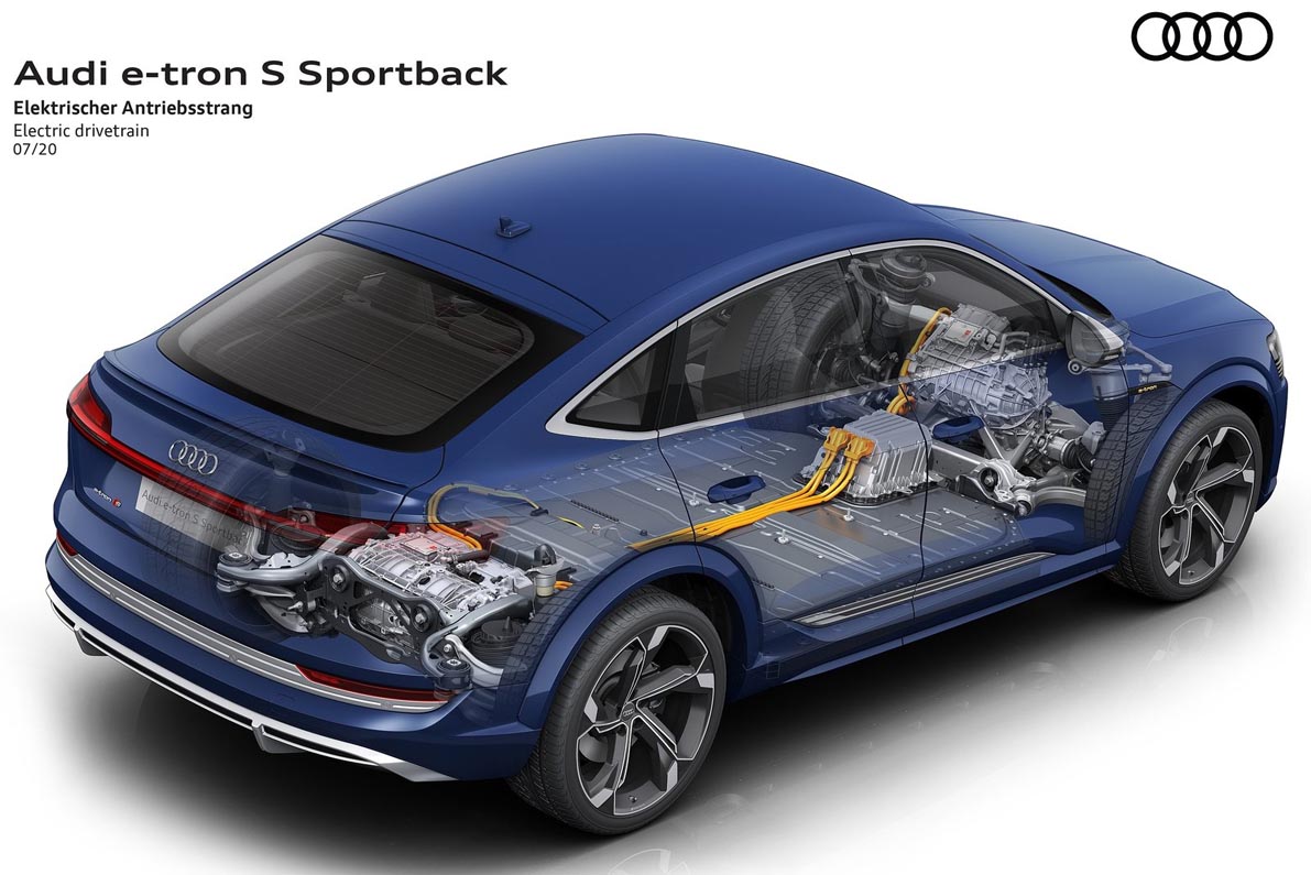 The new S models have two electric motors on the rear axle and one on the front axle, making them the first mass-produced electric cars in the world to have three electric motors. Their drive layout is based on the modular construction principle: An adapted design of the more powerful electric motor that powers rear axle in the Audi e-tron 55 is now installed on the front axle.