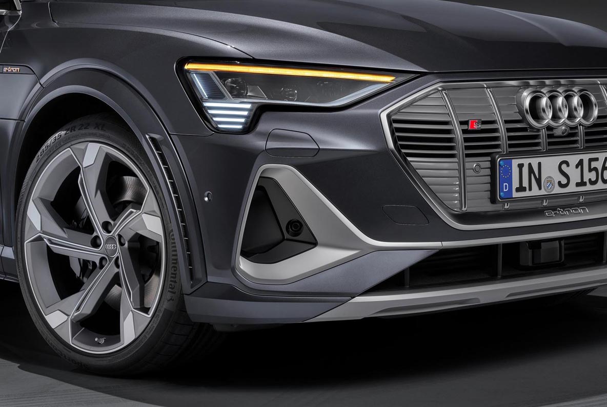 The electric S models are equipped with 20-inch wheels as standard and come with tires that are already 285 millimeters (11.2 in) wide. 21-inch wheels are available upon request and even sportier 22-inch wheels will follow at a later time. Fixed calipers with six pistons each are installed in the front above the large brake disks; fist calipers are installed in the rear. The brake calipers are painted black as standard and feature the S logo. Upon request, they can be painted in a bright orange and decorated with the e-tron logo.