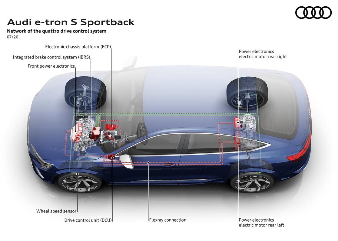 In order to improve efficiency, only the rear electric motors are engaged as long as the Audi e-tron S and the e-tron S Sportback are operating in normal driving mode. The front electric motor flashes into action when the driver demands more performance, or predictively before traction subsides.