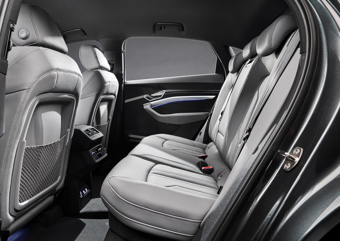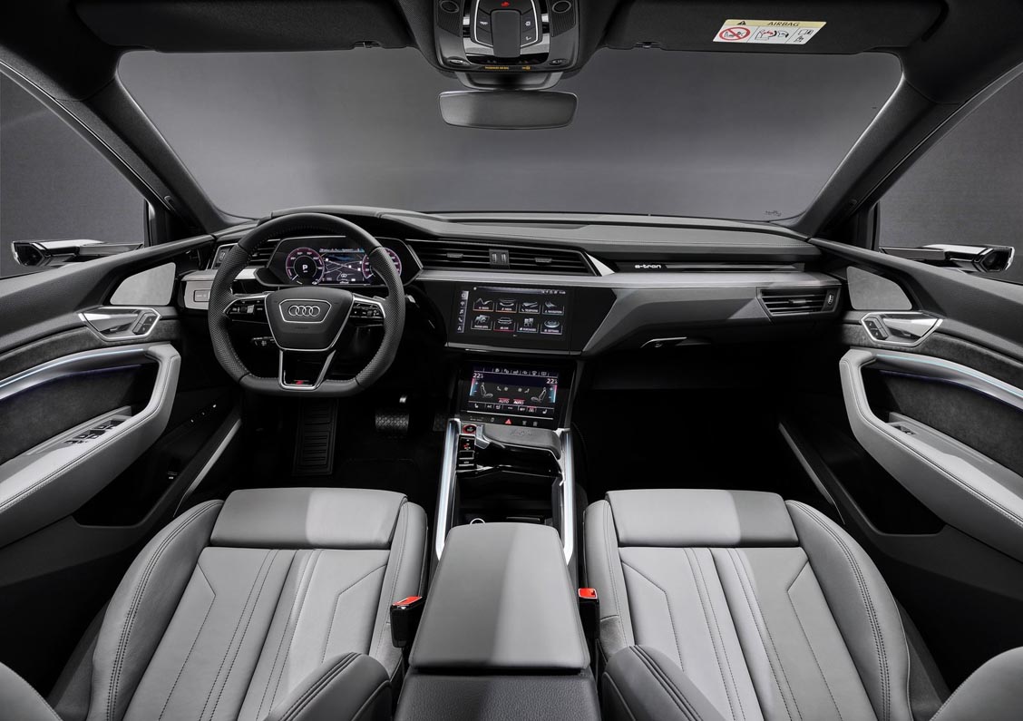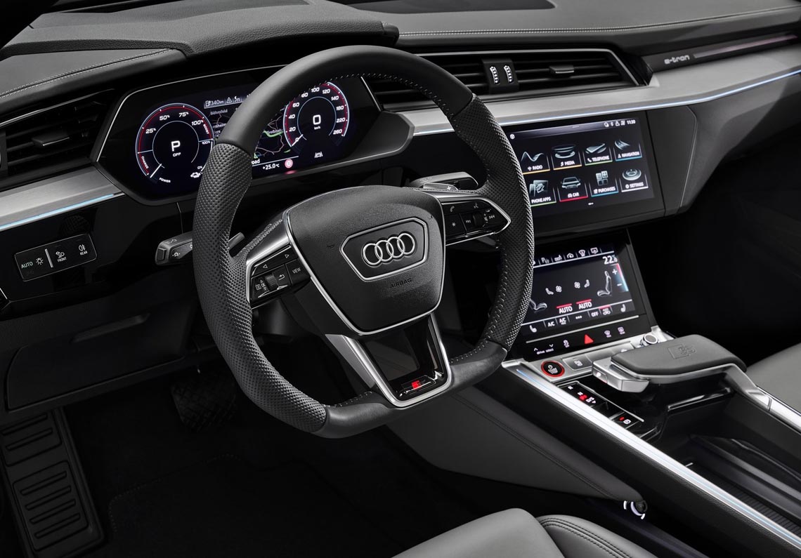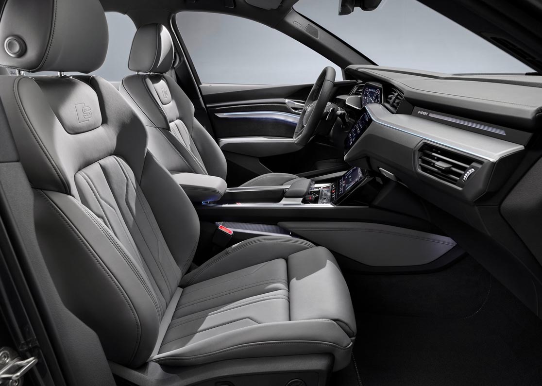 The large high-voltage battery ensures a balanced distribution of the axle loads and is installed in a low position comparable to that of the three electric motors. This lowers the car’s center of gravity, which offers great advantages in terms of handling. The progressive steering, whose ratio becomes increasingly direct as the steering movement increases, emphasizes the sporty character. The suspension has S-specific tuning. The Audi drive select system offers seven driving profiles. For example, it accesses the adaptive air suspension sport – the air suspension with regulated damping can vary the level of the body by up to 76 millimeters (3.0 in) depending on the driving situation and settings.