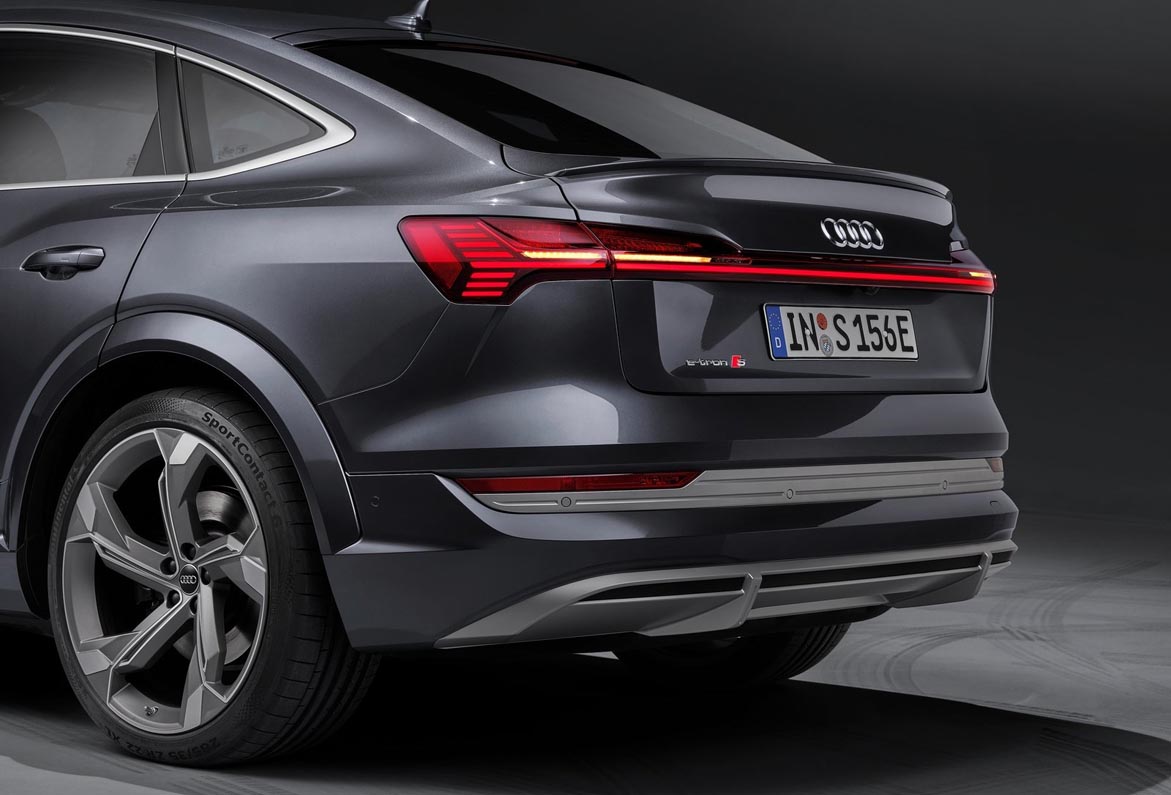 The Audi e-tron S and the Audi e-tron S Sportback reveal their electric power at first glance. Their front and rear bumpers have strong contours, and the air curtains are particularly large and expressive. The diffuser insert at the rear end extends almost across the entire vehicle width. The fact that the wheel arches on both sides are 23 millimeters (0.9 in) wider makes the cars appear very powerful. Silver attachments at the front and rear end add highlights. This, as well as the aluminum exterior mirror housings are exclusive features of the S models Large parts of the body’s lower section can be painted in a contrasting color upon request.
