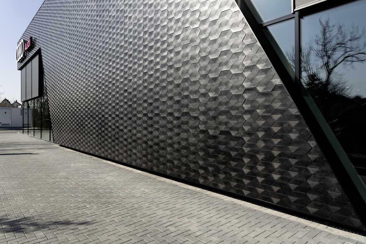 For Audi this store is a beacon project for energy efficiency and sustainability: a CO2-neutral material that Audi has developed with the Berlin start-up Made of Air was used for the first time on the facade of the building, with a brand-specific design. The material that was used permanently captures atmospheric CO2. Moreover, a solar power installation covers the roof of the car dealership. A smart lighting control system and sun shielding ensure ideal illumination inside the building, which can operate without the use of fossil fuels.