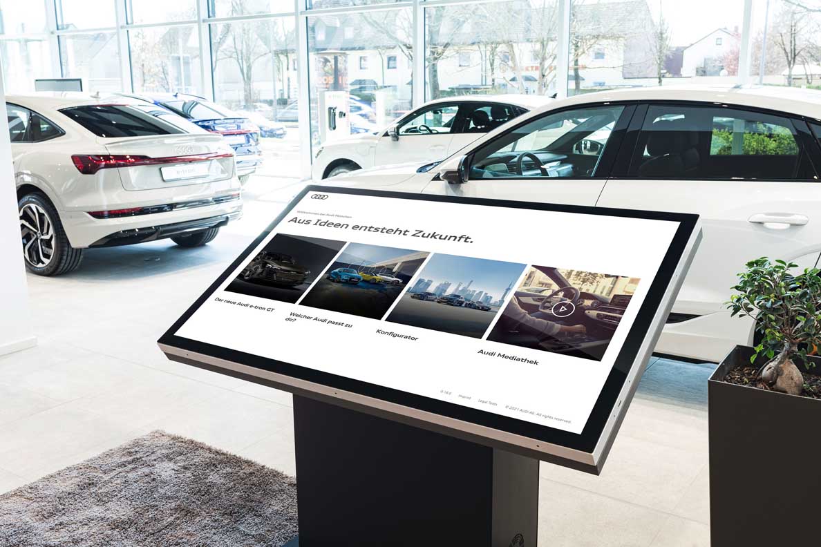 Thanks to interactive modules and large-format visualizations, the customer experience at the store will become even more attractive. In the Audi showroom, a number of new elements can be seen: wall graphics illustrate the current brand campaign with its motto “Future is an attitude.” New furnishings, warmer colors, brand-exclusive sound and high-class fragrances ensure a pleasant atmosphere.