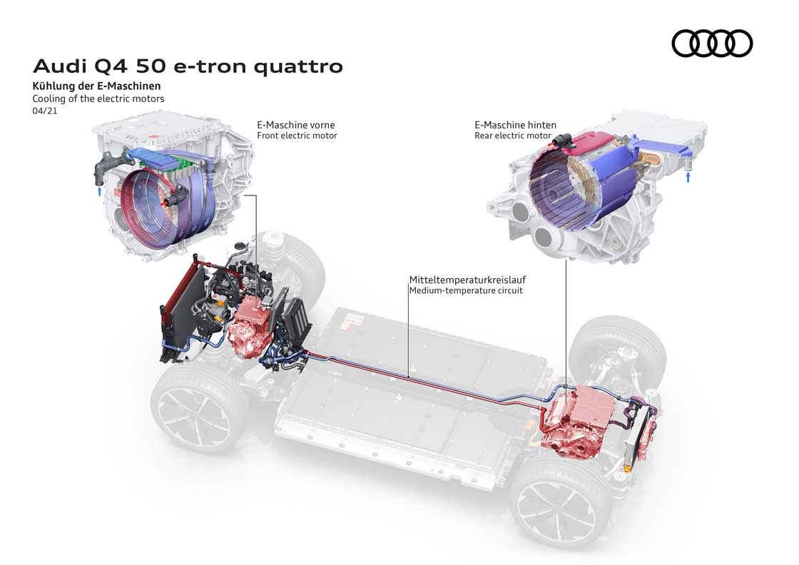 The electric all-wheel drive in the Q4 e-tron top models has an asynchronous motor (ASM) on the front wheels that can rev at up to 14,000 rpm. It is installed coaxially and has combined cooling with coolant and oil. The principal advantages of the ASM are its short-term overload capacity and the minimal drag losses when it is inactive – these are important because the front motor does not contribute to the drive in the majority of driving situations for reasons of efficiency. Its one-speed transmission has a ratio of 10.0:1, and the whole unit comes in at around 60 kilograms on the scales.