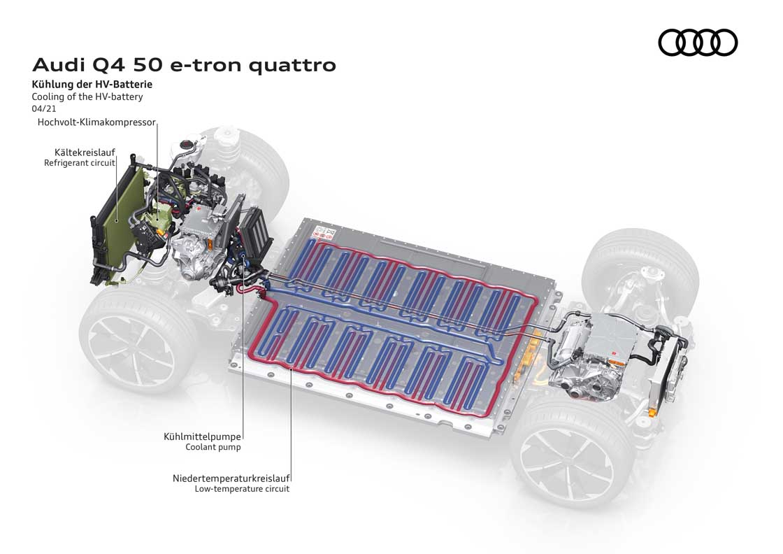 The thermal management system aims to get the battery up to the ideal temperature range of around 30 degrees Celsius quickly after it is started and to keep it there until the end of the journey. This ensures that its full power – and therefore the power of the entire drive system – is available after a short time even in extremely cold conditions. Thanks to the stable thermal conditions, the driver can also call on it repeatedly or charge the battery at an HPC charging terminal with high output. The sophisticated thermal management system also gives the battery a long life cycle – Audi guarantees that it will still have at least 70 percent capacity after eight years of operation or after 160,000 kilometers.