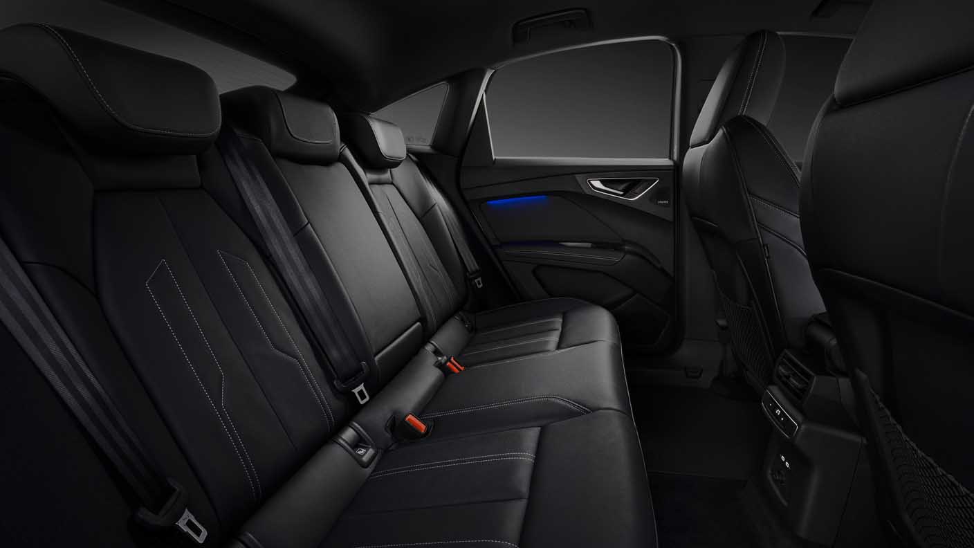 Thanks to their versatility, the Audi Q4 e-tron and the Q4 Sportback e-tron are the perfect companions in every situation. At 4.59 meters in length, they offer a package that gives the passengers on board new spaces and which goes beyond existing class boundaries. The available space in the interior is comparable with the full-size SUV class; there is no center tunnel. The feeling of spaciousness is not just confined to the front seats – with the generous legroom, passengers in the rear also benefit from the advantage of the technological platform, which is designed as electric-only. When it comes to storage compartments, the Q4 e-tron product line scores high grades with total storage space of around 25 liters, and the bottle holders integrated in the upper section of the doors are a further highlight. Even 1-liter bottles can be stored in them safely and in ergonomically ideal reach.