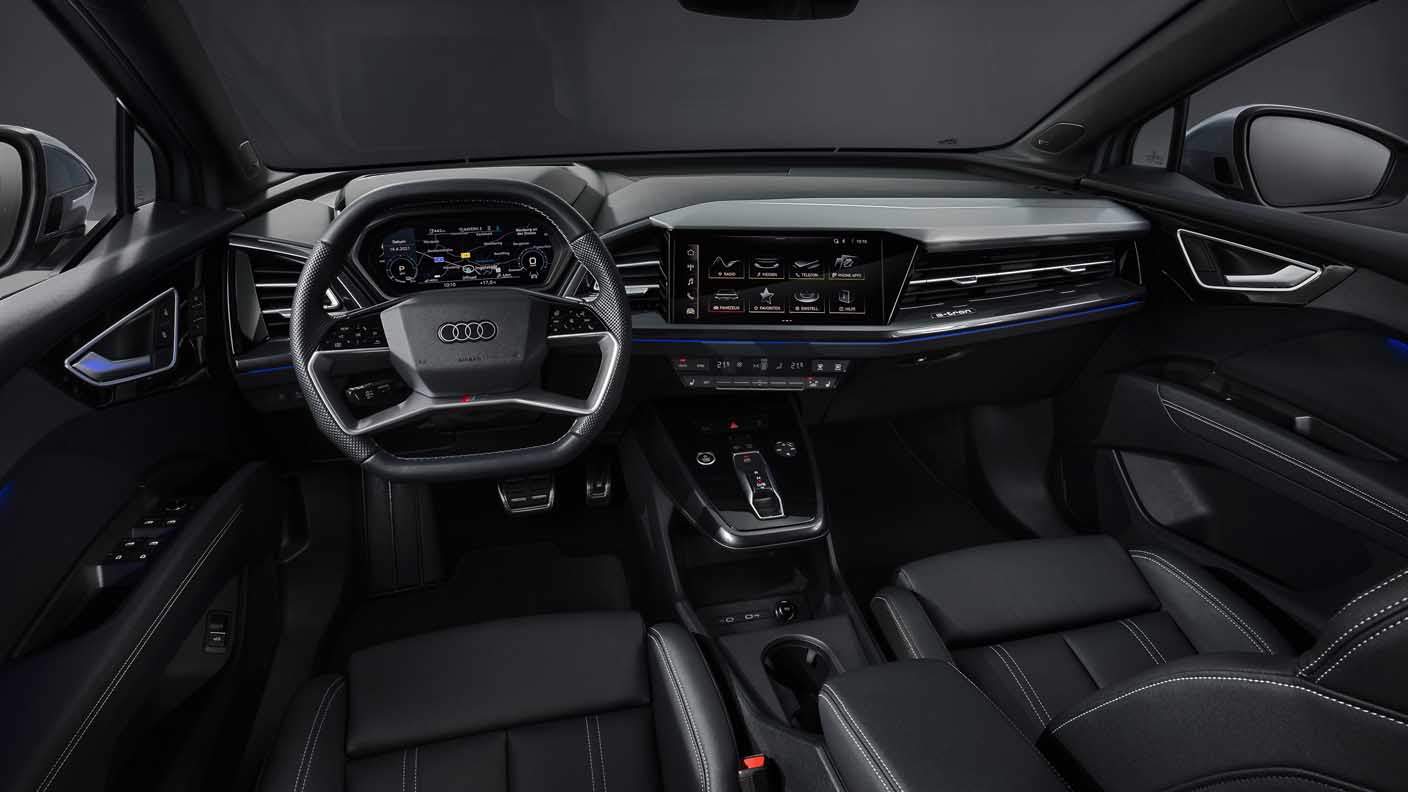 The interior design is based on the S line interior, in the geyser blue Edition model the sport seats come in a mix of black artificial leather and leather. The Q4 e-tron in typhoon gray has steel-gray upholstery with bronze-colored contrasting stitching. On the German market, the Edition models all come with a EUR 6,195 higher price tag than the regular models.