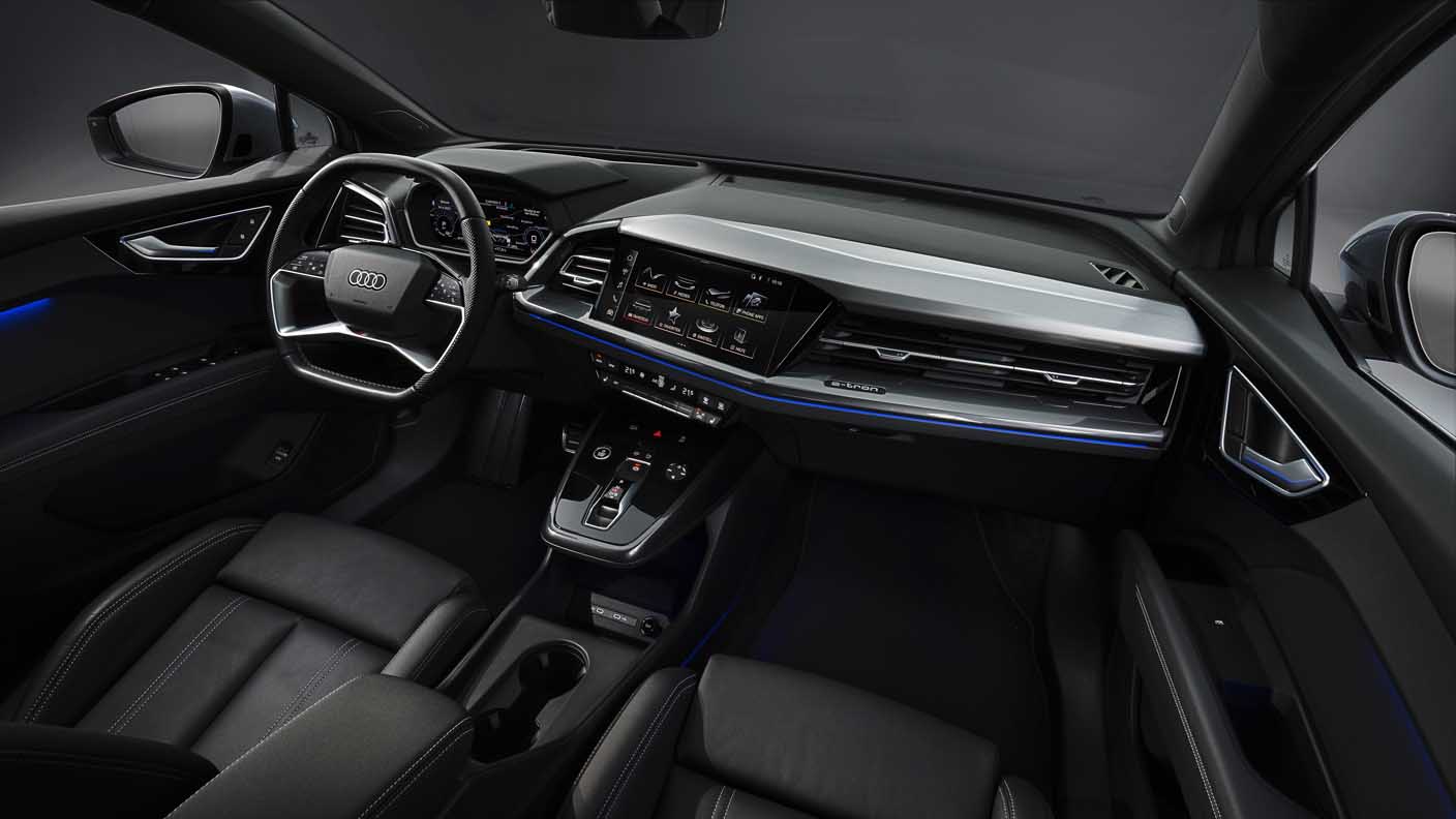 The new era of technology on which Audi has embarked can also be experienced in the interior of the Q4 e-tron and the Q4 Sportback e-tron. The instrument panel introduces itself with progressive elegance and underlines the airy feeling of spaciousness. The cockpit features a distinctly three-dimensional design, and its geometric volumes are interrelated in an electrifying way.