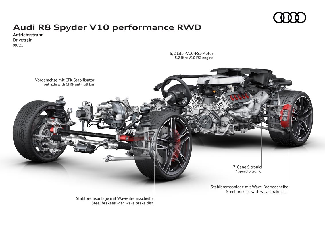 The Audi R8 V10 performance RWD (Rear Wheel Drive) is the sporty new cutting edge of serial rear-wheel drive sports cars from Audi. “The Audi R8 V10 RWD really struck a chord with customers right from the start with its rear-wheel drive derived from the R8 LMS racecar and its unfiltered dynamics. Now it has 30 PS and 10 newton meters more, taking the driving experience to a whole new level,” says Sebastian Grams, Managing Director of Audi Sport GmbH. The base versions of both models, the R8 V10 quattro5/6 and the R8 V10 RWD7/8 as a Coupé and Spyder, will be replaced by the new performance models. This puts the R8 model range more firmly in the top position.