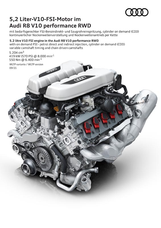 1. Audi Coupé R8 V10 performance RWD: Combined fuel consumption in l/100 km: 12.9 (18.2 US mpg); Combined CO2 emissions in g/km: 295 – 294 (474.8 – 473.1 g/mi)