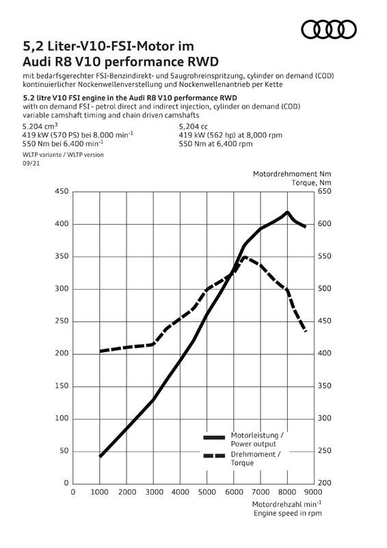 Even more power, even more fun: the true meaning of “performance” at the Audi Sport GmbH. The new R8 V10 performance RWD is available as a Coupé or Spyder with 30 PS extra, a sporty complement to the R8 V10 performance quattro. This rear-wheel drive sports car, with its mid-mounted engine boasting 419 kW (570 PS)1/2 and new technological highlights such as bucket seats, dynamic steering, CFK stabilizers and ceramic disc brakes, is the embodiment of fun driving.