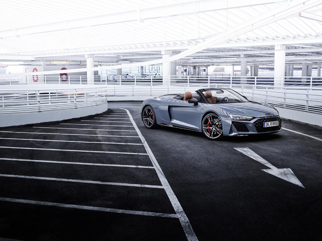The overly sporty design is inspired by its GT4 siblings. Elements of this include the broad, flat Singleframe radiator grill in matte black with an R8 emblem flanked by large air intakes, the front splitter and rear air outlet grid as well as the oval tailpipes. The slit under the front hood is reminiscent of the legendary Audi Sport quattro. The new R8 is available in ten color options. One of them is Ascari Blue Metallic, a color that was previously only available for the R8 V10 performance quattro3/4. The “R8 performance” design package boasts an interior with black Alcantara leather, contrast stitching in Mercato Blue and decorative carbon inlays.