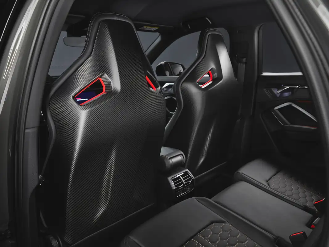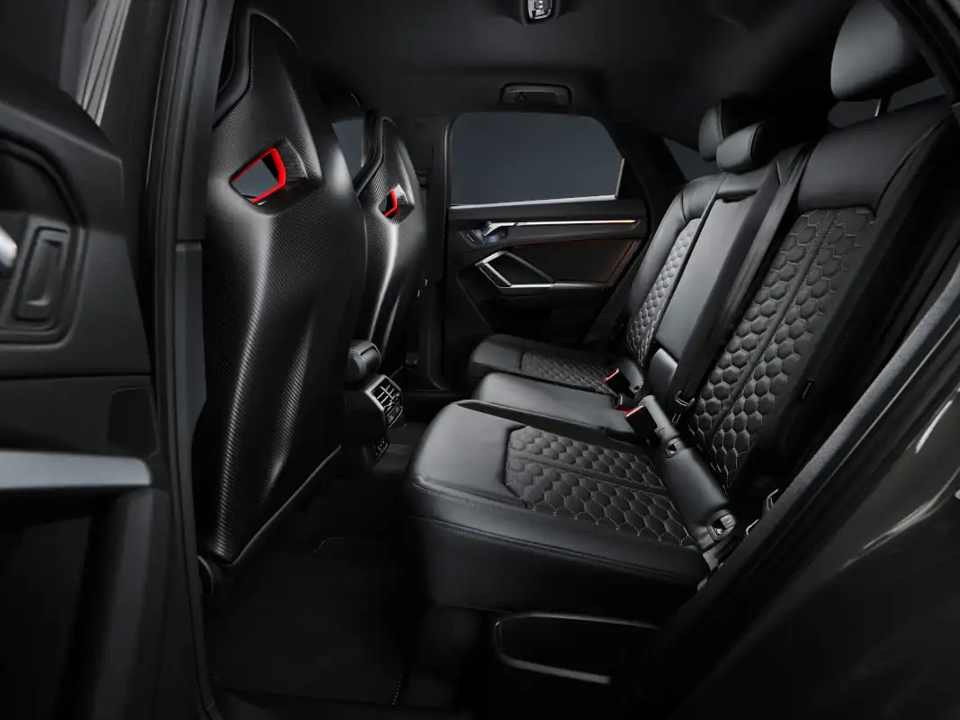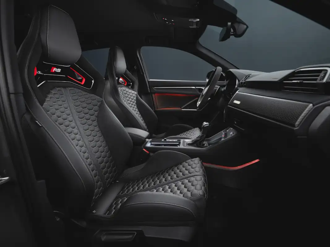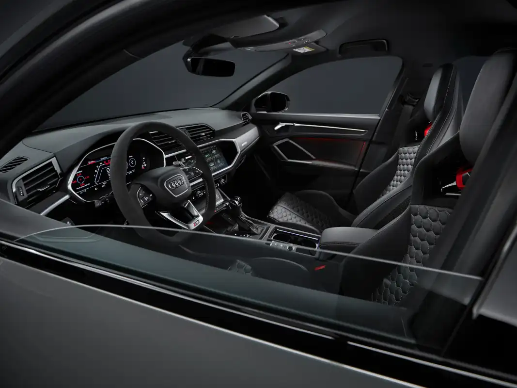 Passengers take their seats in new RS bucket seats that are exclusive to this edition. The RS emblems in the neck area of the seat are impressive. The seatback cover in matte Carbon, which is being used for the first time in the RS Q3, is a special highlight. The bucket seats are upholstered in a leather-Dinamica combination in black and jet black – the new, sporty, elegant color. Dinamica is a microfiber and consists of around 45% recycled PET fibers. In addition to the seats, it is also used on the instrument panel application. The copper-colored stitching, which is repeated throughout the entire interior, creates a special contrast. This applies, for example, to the honeycomb stitching in the center of the seat, the center armrest, the door armrest, the steering wheel – which is available either in a round or flat bottom version – and the black floor mats with glossy copper-embroidered RS Q3 lettering. The edition 10 years also boasts exclusive decorative inlays in Carbon – such as the seat back cover in a matte finish. The MMI display has a carbon look – the 10.1 inch touch display features “1 of 555” lettering. The edition-specific illuminated door sill trims project a red 3D diamond onto the ground when the doors are opened.