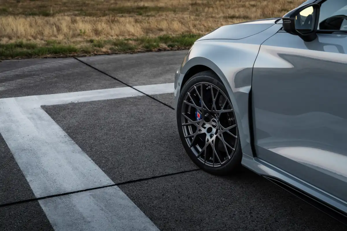 The RS3 performance edition runs on semi-slick Pirelli P Zero “Trofeo R” tires as standard equipment – 265/35 on the front axle, 245/35 on the rear. Due to their specific rubber compound and asymmetrical tread, these performance tires offer particularly high grip in dry conditions, thus increasing stability and lateral grip. In keeping with their characteristics, the semi-slicks are mounted on cast aluminum wheels in motorsport design. The 19 inch rims in dark gray matte, exclusively available on the special model, have a striking design with ten cross-spokes and display the RS branding. Behind it, the standard six-piston ceramic brake takes a firm grip. Their discs on the front axle measure 380 x 38 mm (15 x 1.5 in.). The high-performance brake system, with a specially adapted pedal curve on the brake booster, is ten kilograms (22 lbs) lighter and more heat-resistant than the steel brakes. The reduction in unsprung masses brings advantages in highly dynamic applications. The rear axle has a floating caliper with 310 x 22 mm (12.2 x 0.9 in.) single-piece steel discs. The brake calipers are painted blue to match the specific interior.